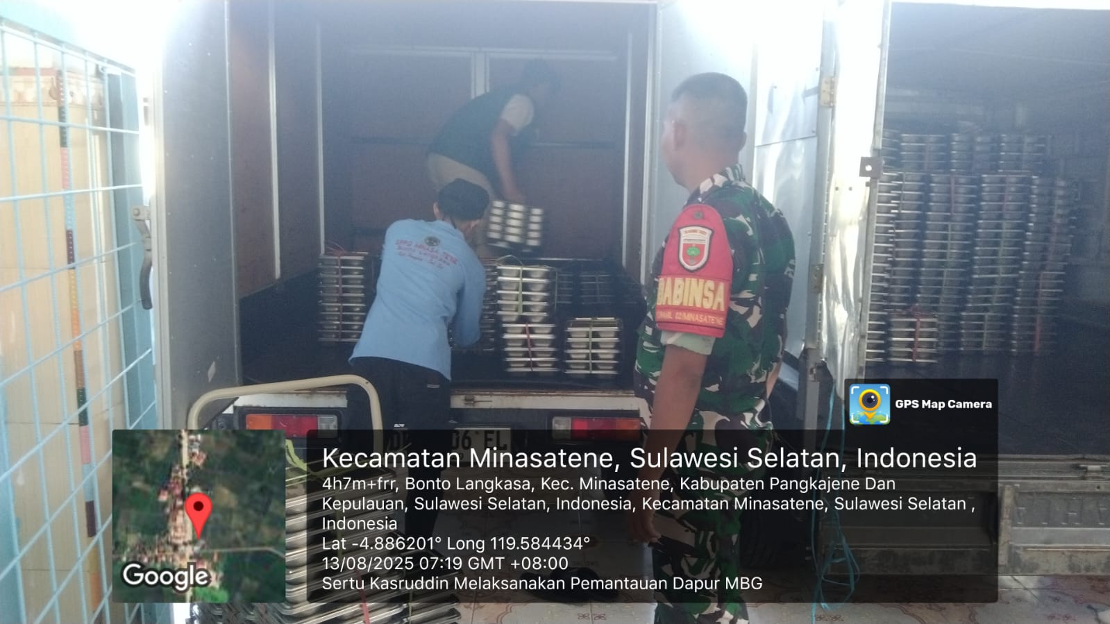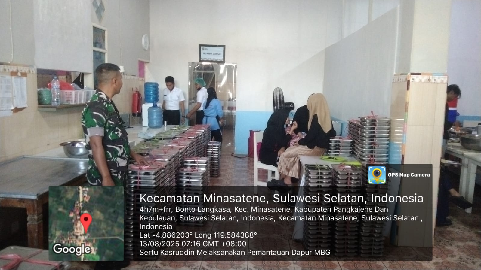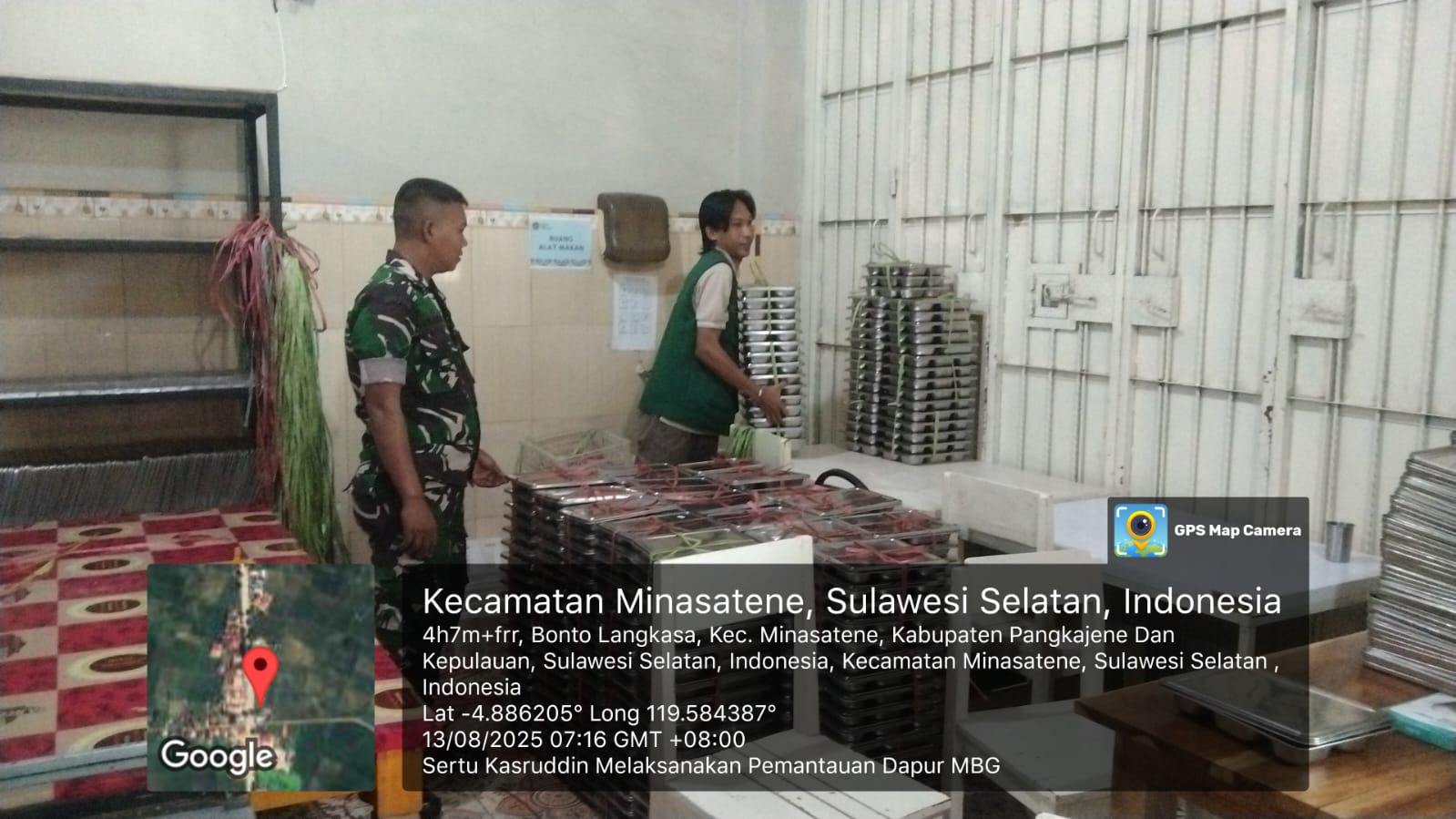 klivetvindonesia.com, PANGKEP – Dalam rangka mendukung dan mengawal suksesnya Program Makan Bergizi Gratis (MBG) yang digagas Presiden Republik Indonesia, Prabowo Subianto, Babinsa Kelurahan Bonto Langkasa, Sertu Kasruddin dari Koramil 1421-02/Minasatene, melaksanakan pemantauan langsung proses penyiapan makanan di Dapur Sehat MBG, Rabu (13/8/2025) pagi.