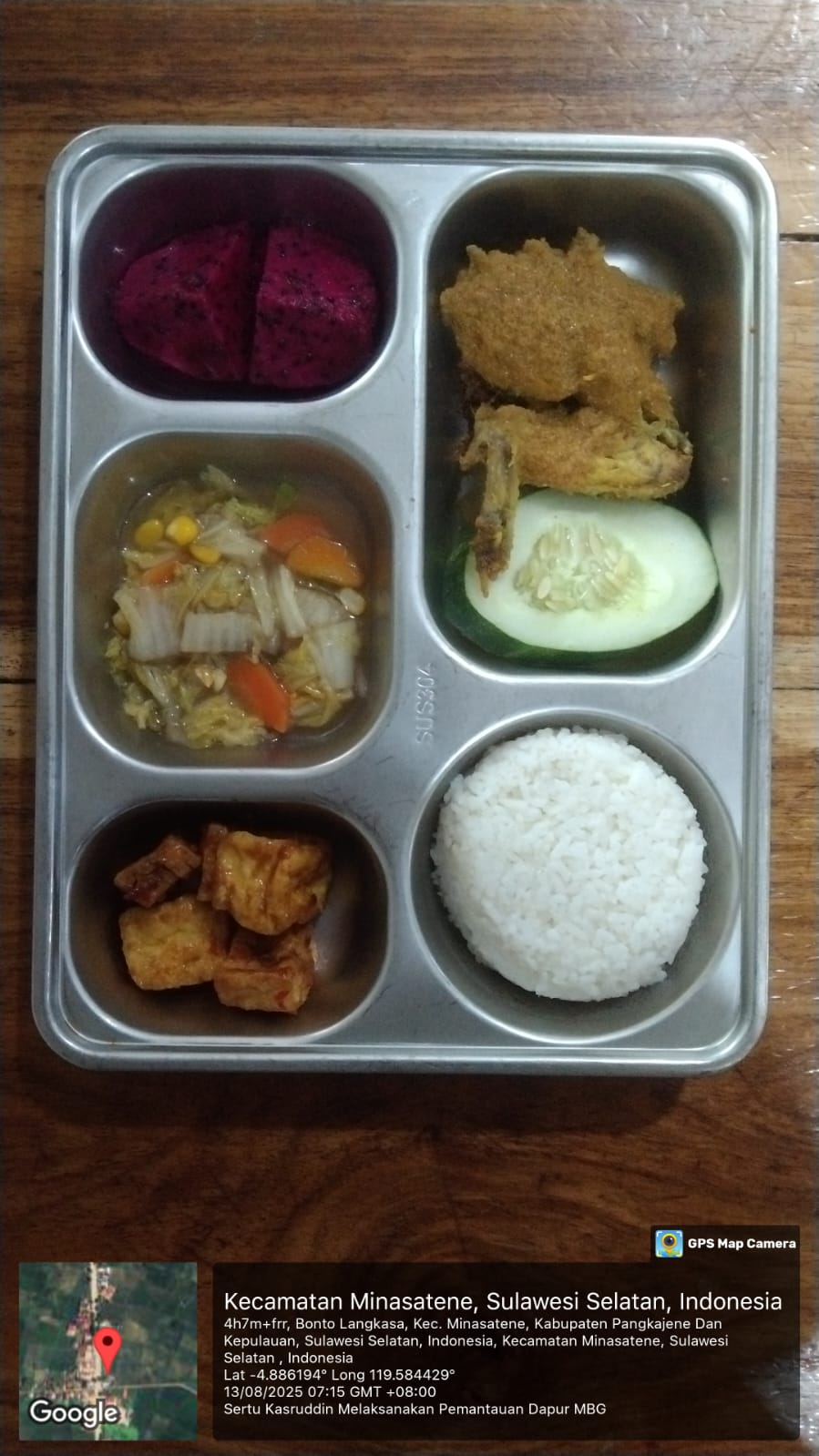 Menu makan bergizi yang disiapkan meliputi nasi putih, ayam goreng lengkuang, tahu goreng dadu, tumis sawi putih, serta buah segar berupa semangka atau naga. Seluruh proses pengolahan dilakukan dengan menjaga standar kebersihan yang ketat, di mana para pekerja menggunakan masker dan sarung tangan untuk memastikan kualitas dan keamanan makanan.