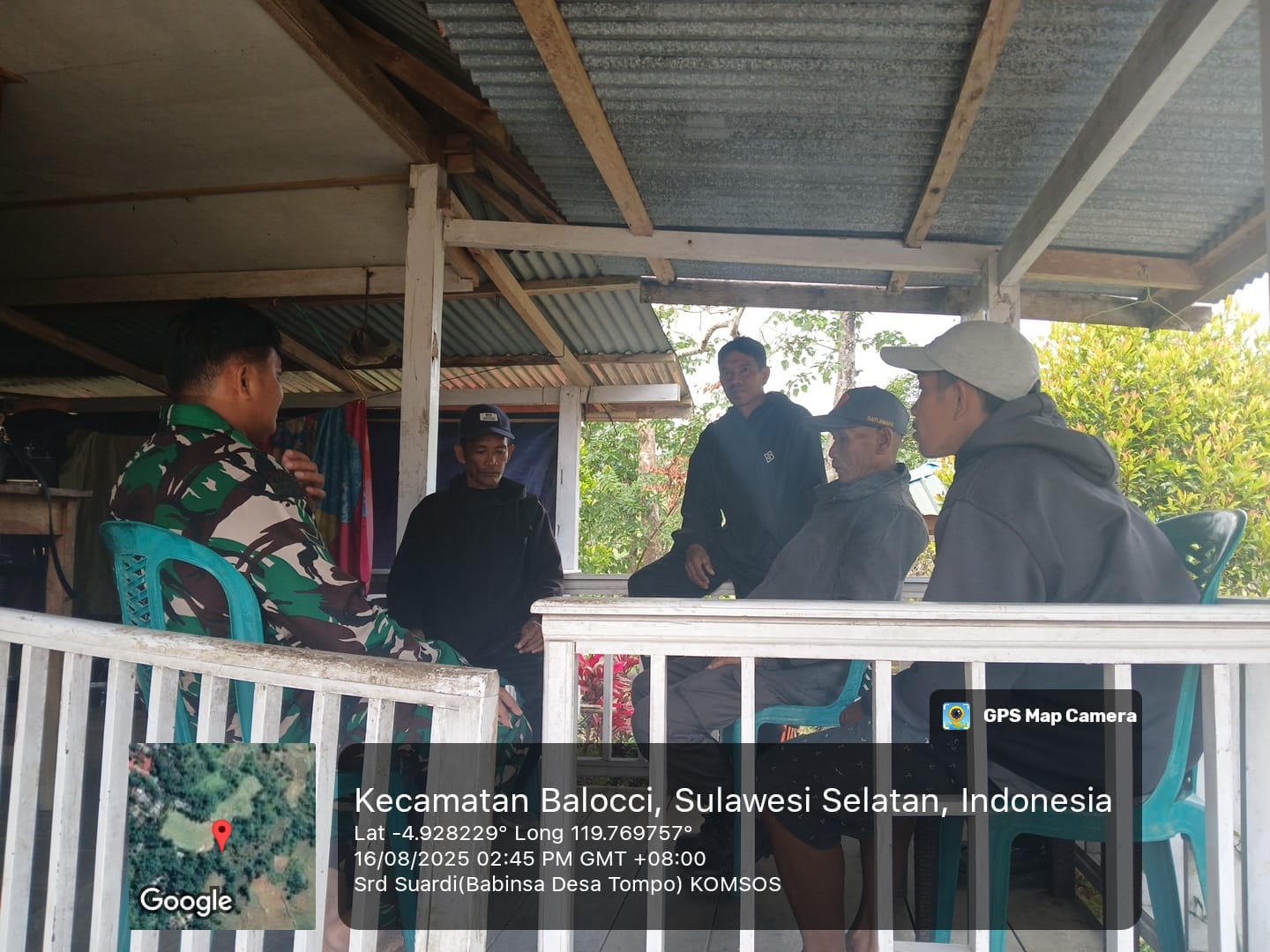 klivetvindonesia.com, Balocci – Dalam rangka mempererat hubungan antara TNI dan masyarakat, Babinsa Desa Tompo Bulu, Serda Suardi, melaksanakan kegiatan Komunikasi Sosial (Komsos) bersama warga Dusun 01 Bulu-Bulu, Kecamatan Balocci, Kabupaten Pangkep, pada Sabtu (16/8/2025) pukul 13.30 Wita. Kegiatan berlangsung di rumah salah satu warga, Bapak Mukhtar, dengan suasana penuh keakraban dan kebersamaan.