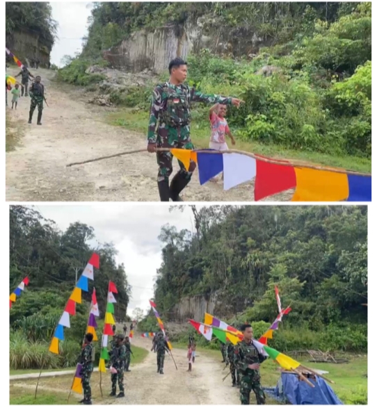 Selain itu, personel Pos Kokas juga turut menggandeng masyarakat setempat untuk terlibat langsung dalam pemasangan bendera di rumah-rumah warga, fasilitas umum, serta sepanjang jalan kampung binaan. Antusiasme masyarakat terlihat tinggi, terutama anak-anak dan para pemuda yang ikut serta dalam kegiatan tersebut.