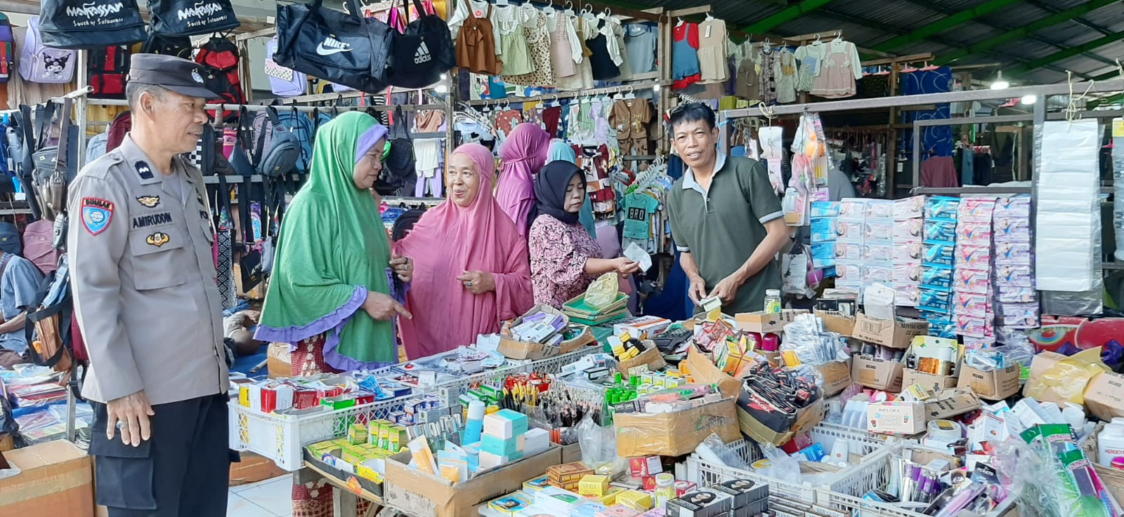 Dalam kegiatan tersebut, Aipda Amiruddin menyapa para pedagang dan pengunjung pasar sambil memberikan imbauan kamtibmas agar tetap waspada terhadap potensi tindak kejahatan seperti pencopetan dan penipuan, serta mengajak masyarakat menjaga kebersihan lingkungan pasar.