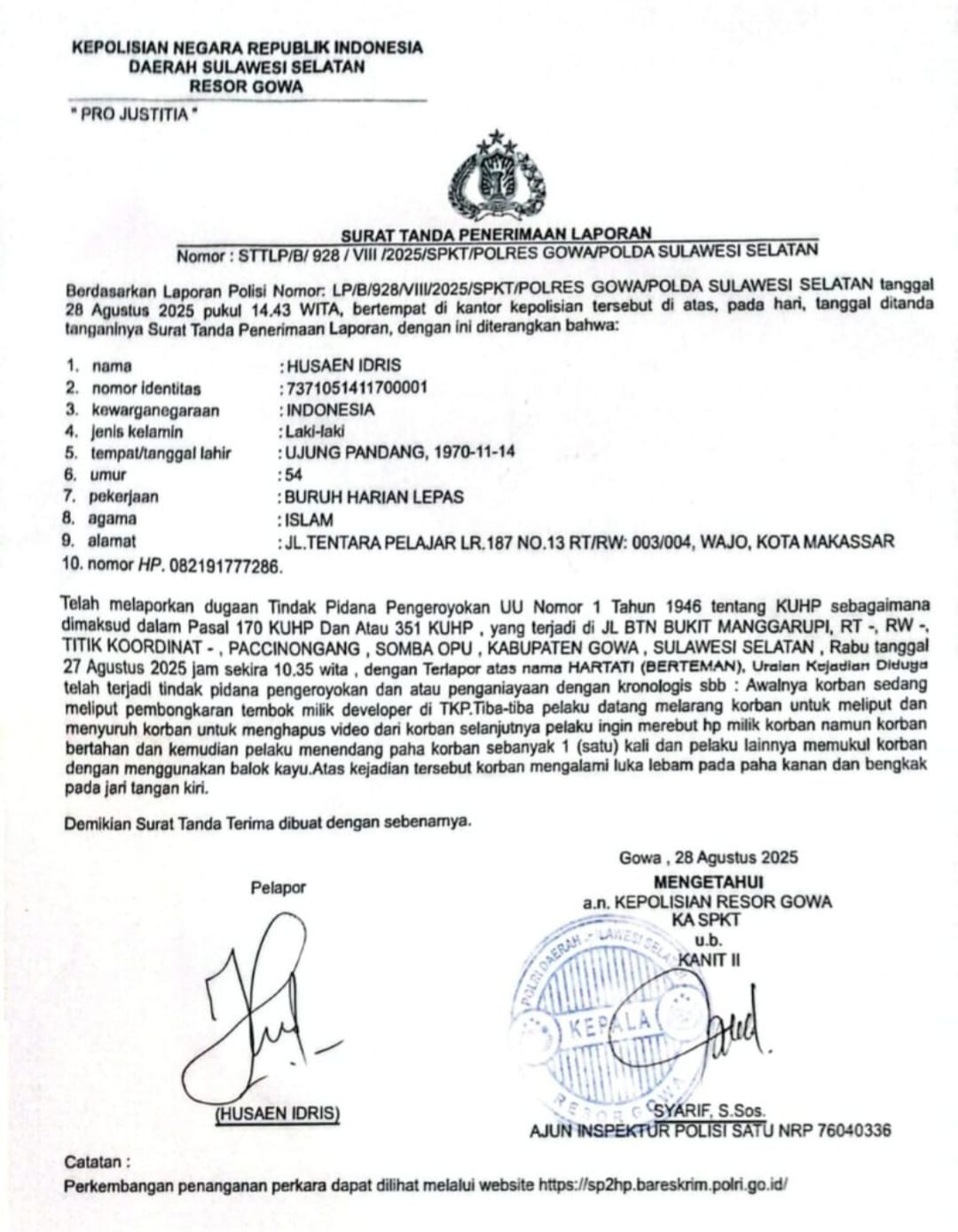 Lanjut Risal Bakri. Meski korban sudah melaporkan hal ini di mapolres Gowa, Berdasarkan Surat Tanda Penerimaan Laporan Polisi Nomor: LP/B/928/VIII/2025/SPKT/POLRES GOWA/POLDA SULSEL,