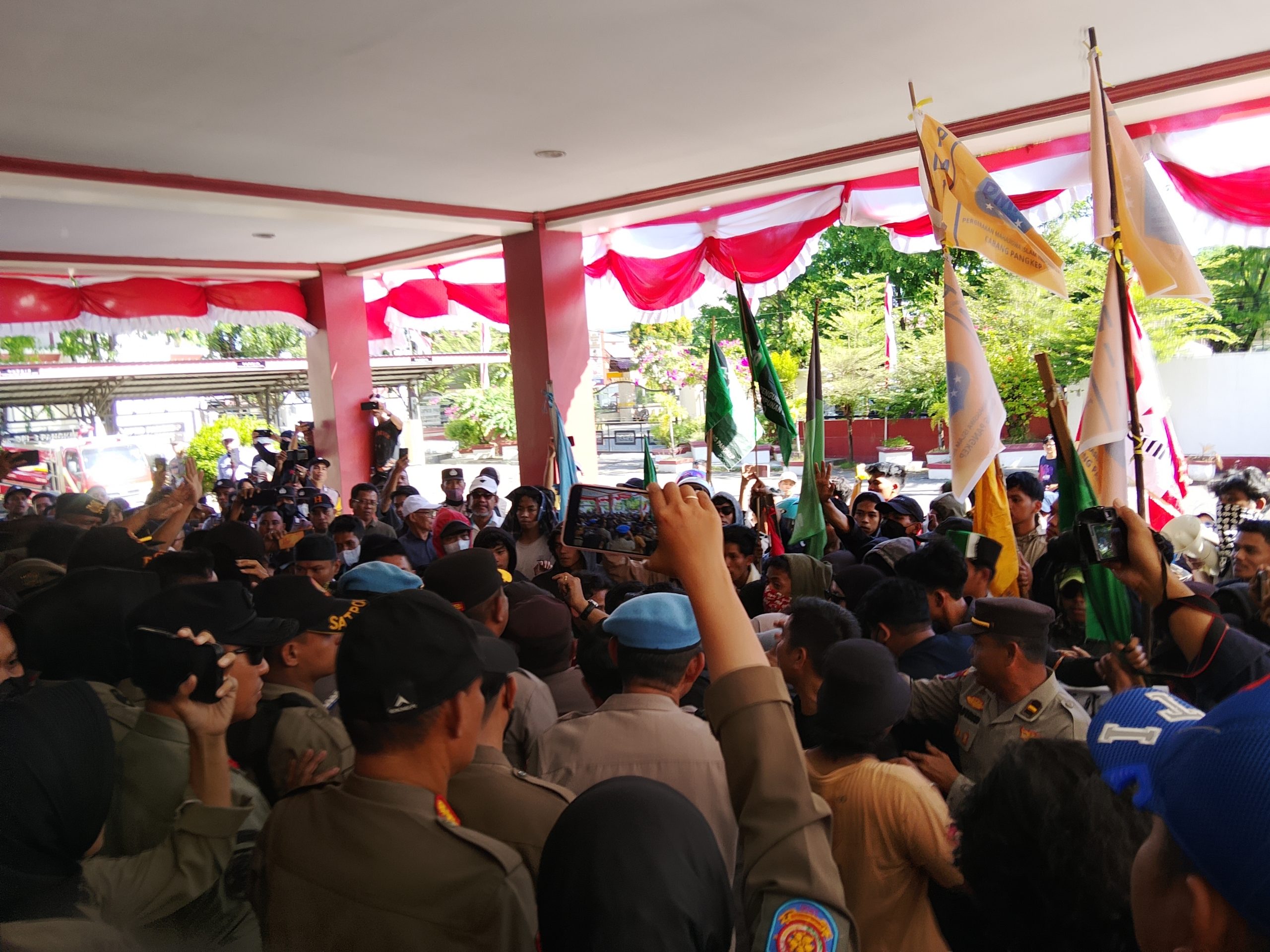 klivetvindonesia.com, PANGKEP – Aliansi Mahasiswa Pangkep menggelar aksi unjuk rasa di depan kantor DPRD Pangkep Kecamatan Pangkajene, dengan pengawalan ketat dari aparat kepolisian, Pangkep, Senin (01/09/2025).