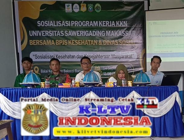 klivetvindonesia.com, Pangkep – Kepala Kelurahan Balocci Baru, Maryam S.Pd., MM, menghadiri sekaligus memberikan dukungan penuh pada kegiatan Sosialisasi Program Kerja Kuliah Kerja Nyata (KKN) Universitas Sawerigading Makassar yang dilaksanakan bersama BPJS Kesehatan dan Dinas Sosial, bertempat di Aula Kelurahan Balocci Baru, Kecamatan Balocci, Kabupaten Pangkep, Kamis (04/09/2025).