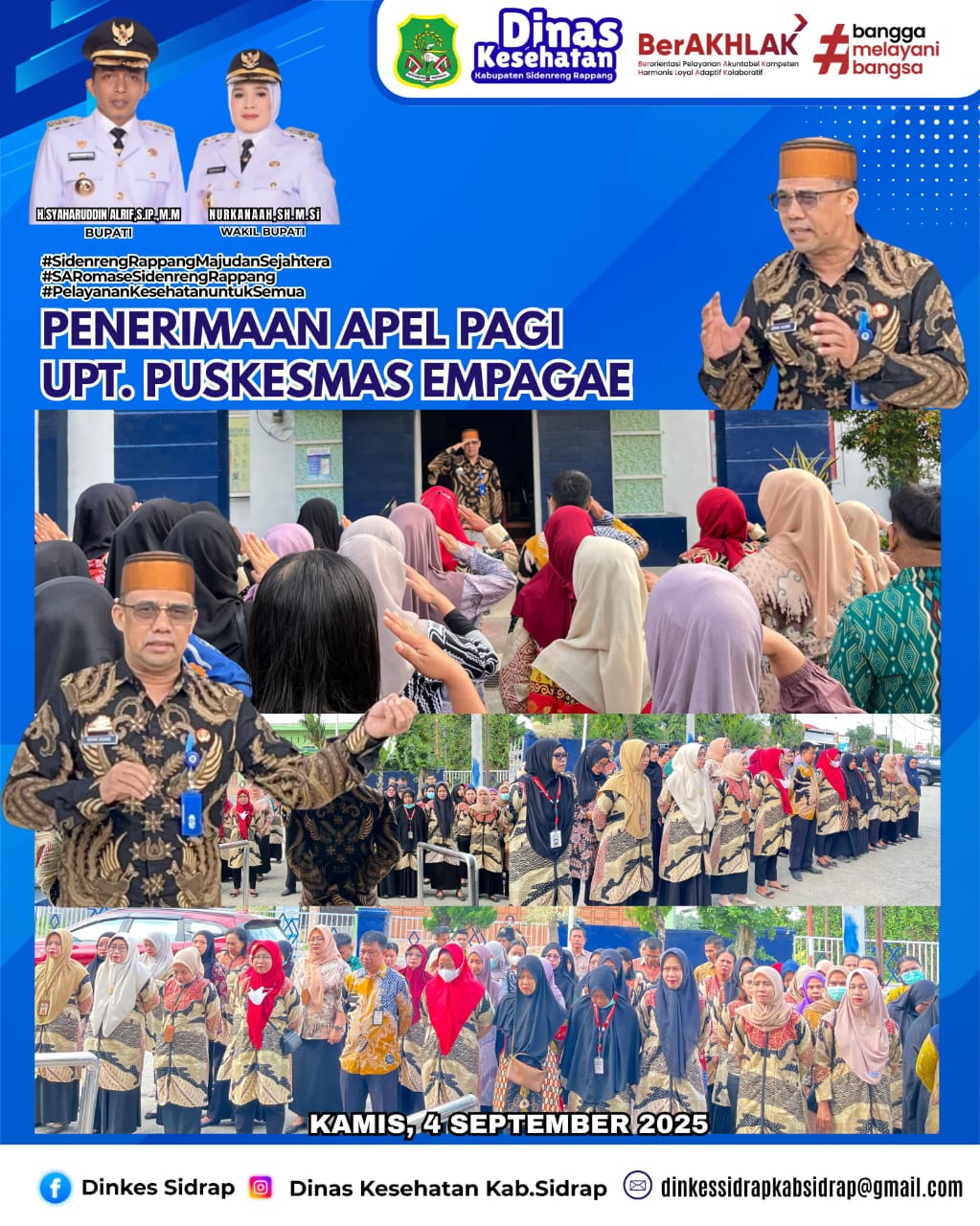Apel pagi kali ini berbuah semangat baru, dan Apel pagi dkali ini terasa berbeda dengan kehadiran Plh Kepala Dinas Kesehatan Sidrap, Dr. Ishak Kenre. Kedatangan beliau menjadi sebuah kehormatan dan memberikan suntikan motivasi yang besar bagi seluruh staf.