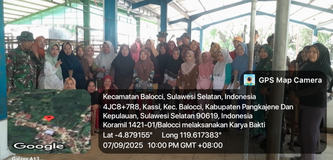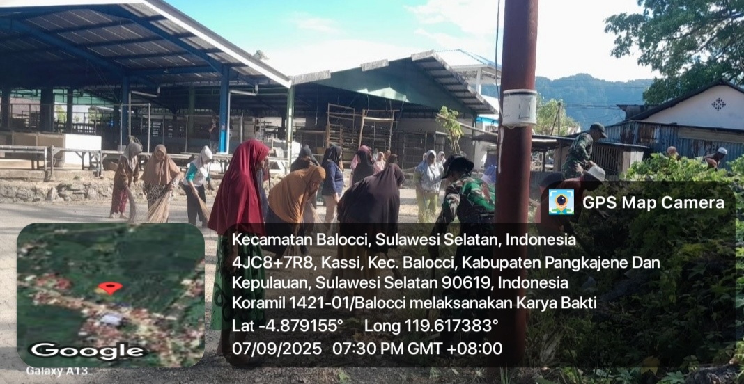 klivetvindonesia.com,Pangkep – Semangat gotong royong kembali ditunjukkan oleh TNI bersama pemerintah kelurahan dan masyarakat dalam kegiatan karya bakti pembersihan yang digelar pada Minggu pagi, 07 September 2025. Kegiatan yang dipusatkan di Pasar Rakyat Kassi serta area pekuburan Kassi, Kelurahan Kassi, Kecamatan Balocci, Kabupaten Pangkep ini berlangsung sejak pukul 07.30 Wita hingga selesai dengan suasana penuh kekompakan.