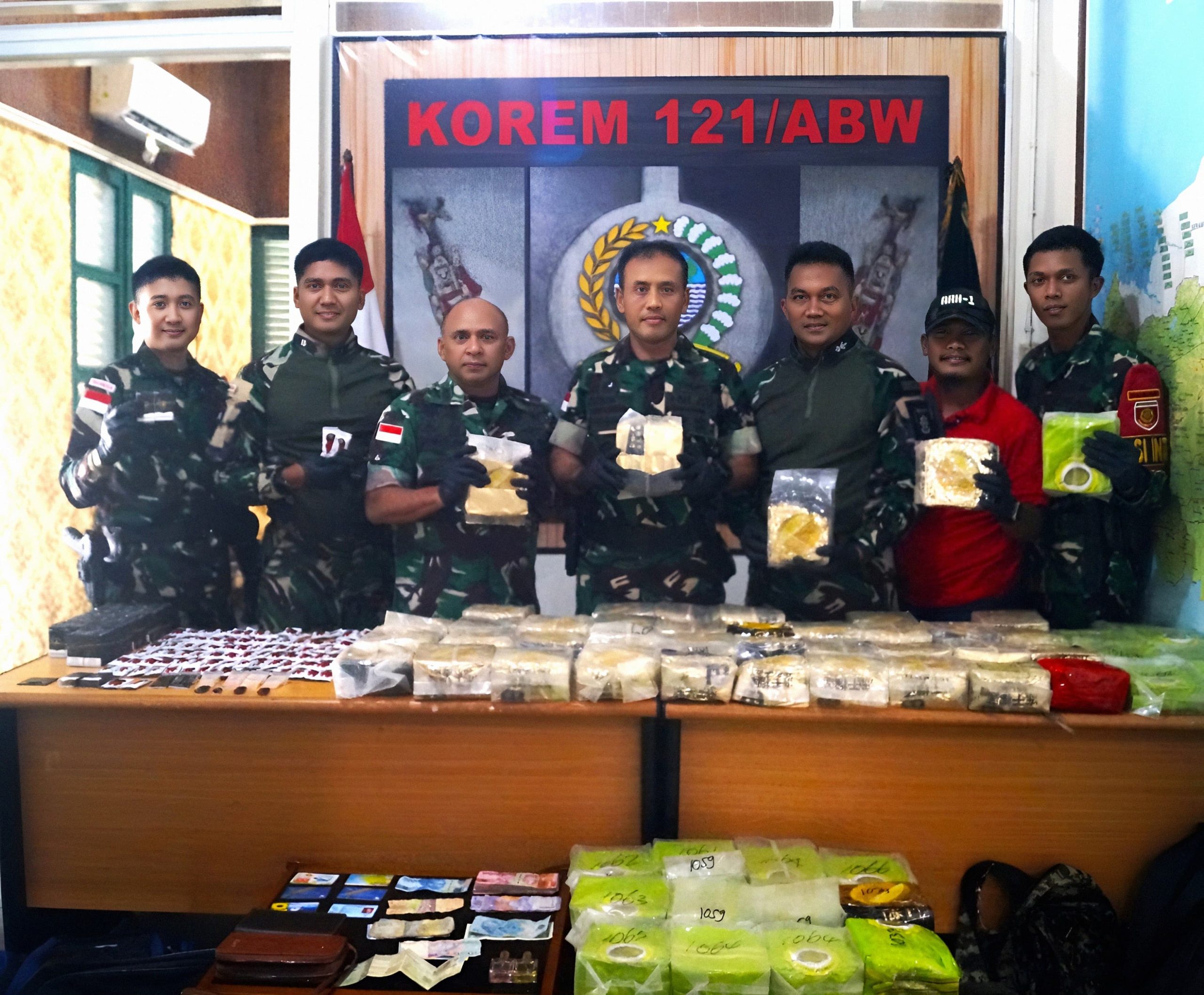 Brigjen TNI Purnomosidi Selaku Dankolakopsrem 121/Abw Terima Barang Bukti Narkoba Berupa Shabu Dari Dansatgas Pamtas RI- Malaysia Yonarhanud 1/PBC Kostrad Hasil Penggagalan Penyelundupan Di Wilayah Perbatasan