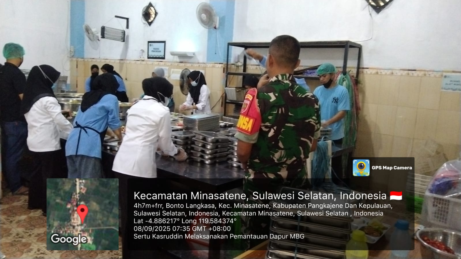 klivetvindonesia.com,Pangkep, 8 September 2025 – Dalam rangka mendukung penuh Program Presiden Republik Indonesia, Bapak Prabowo Subianto, terkait penyediaan Makan Bergizi Gratis (MBG) bagi anak sekolah, Babinsa Kelurahan Bonto Langkasa, Sertu Kasruddin, melaksanakan pemantauan langsung proses penyiapan makanan di Dapur Sehat MBG yang berlokasi di Jalan Poros Makassar–Parepare, Kelurahan Bonto Langkasa, Kecamatan Minasatene, Kabupaten Pangkep, Senin (8/9/2025) pukul 07.00 Wita.
