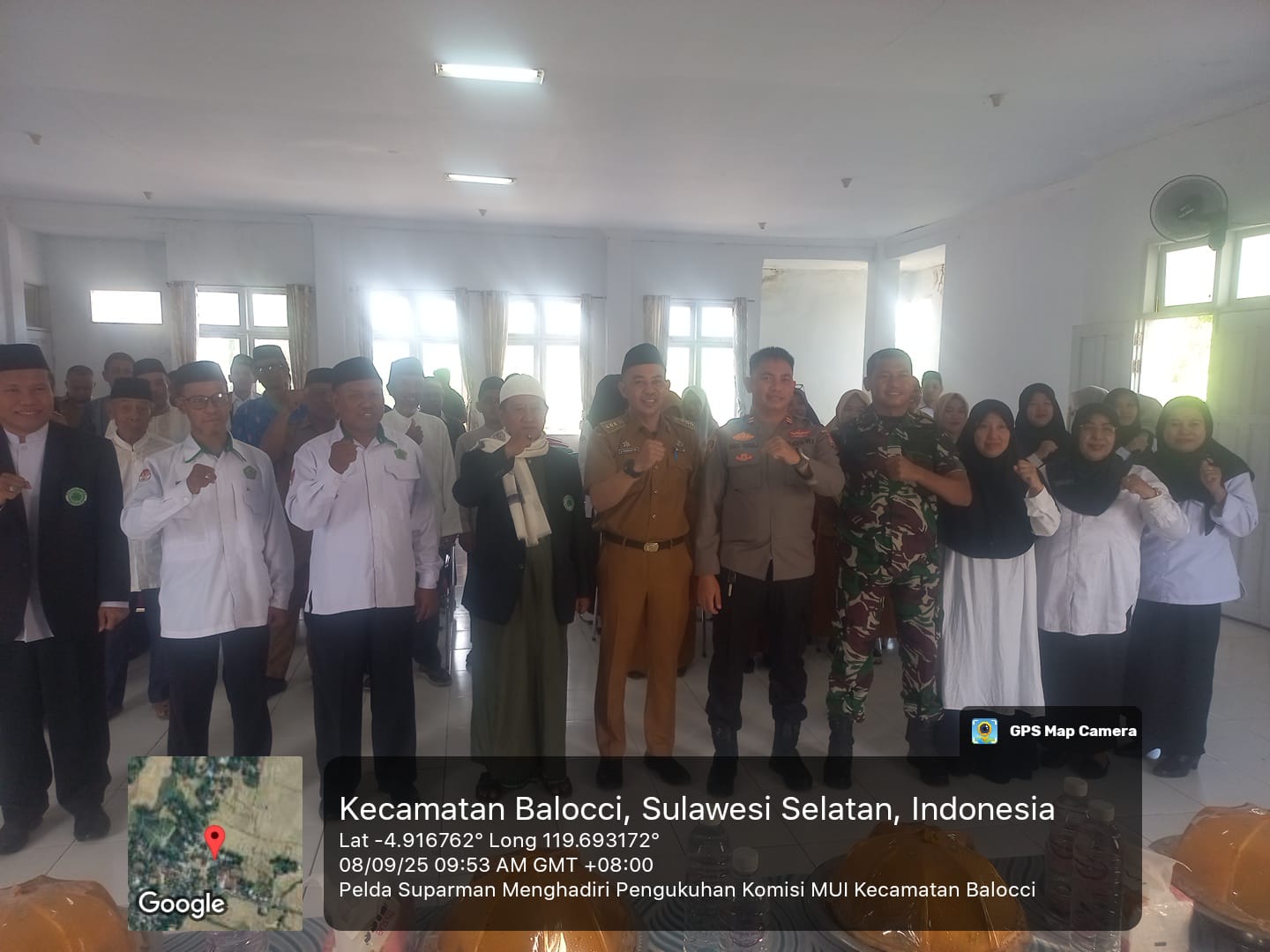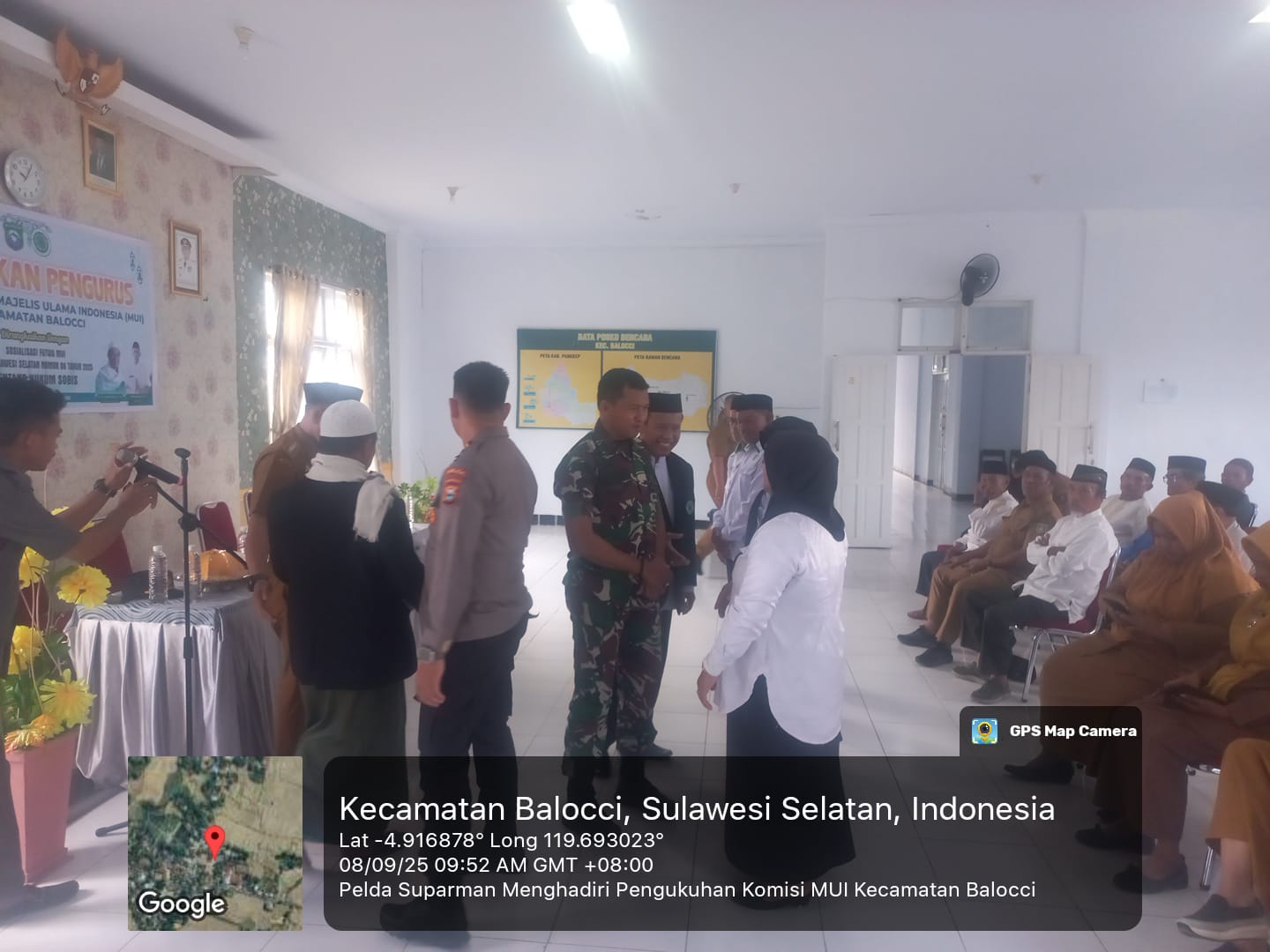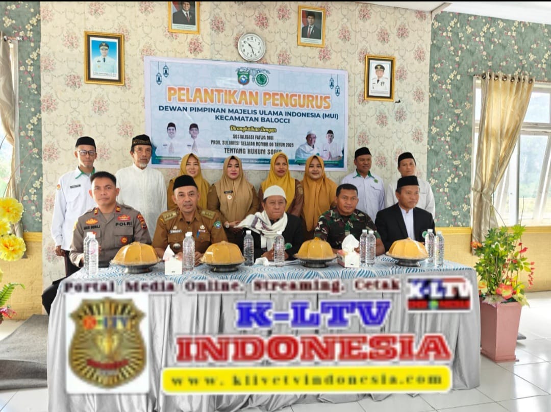 klivetvindonesia.com,Balocci, Pangkep – Dalam upaya mempererat sinergi antara TNI dengan para tokoh agama dan masyarakat, Batuud koramil 1421-01/Balocci, Pelda Suparman, bersama Babinsa Kelurahan Balleanging, Serda Bahtiar, menghadiri acara Pelantikan Pengurus Dewan Pimpinan Majelis Ulama Indonesia (MUI) Kecamatan Balocci yang dirangkaikan dengan sosialisasi Fatwa MUI Provinsi Sulawesi Selatan Nomor 06 Tahun 2025 tentang Hukum SOBIS. Kegiatan ini digelar pada Senin, 08 September 2025, bertempat di Aula Kantor Camat Balocci, Kelurahan Balleanging, Kecamatan Balocci, Kabupaten Pangkep.