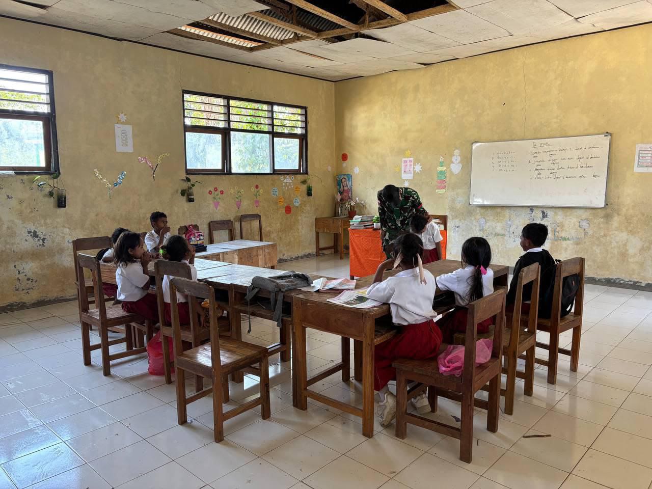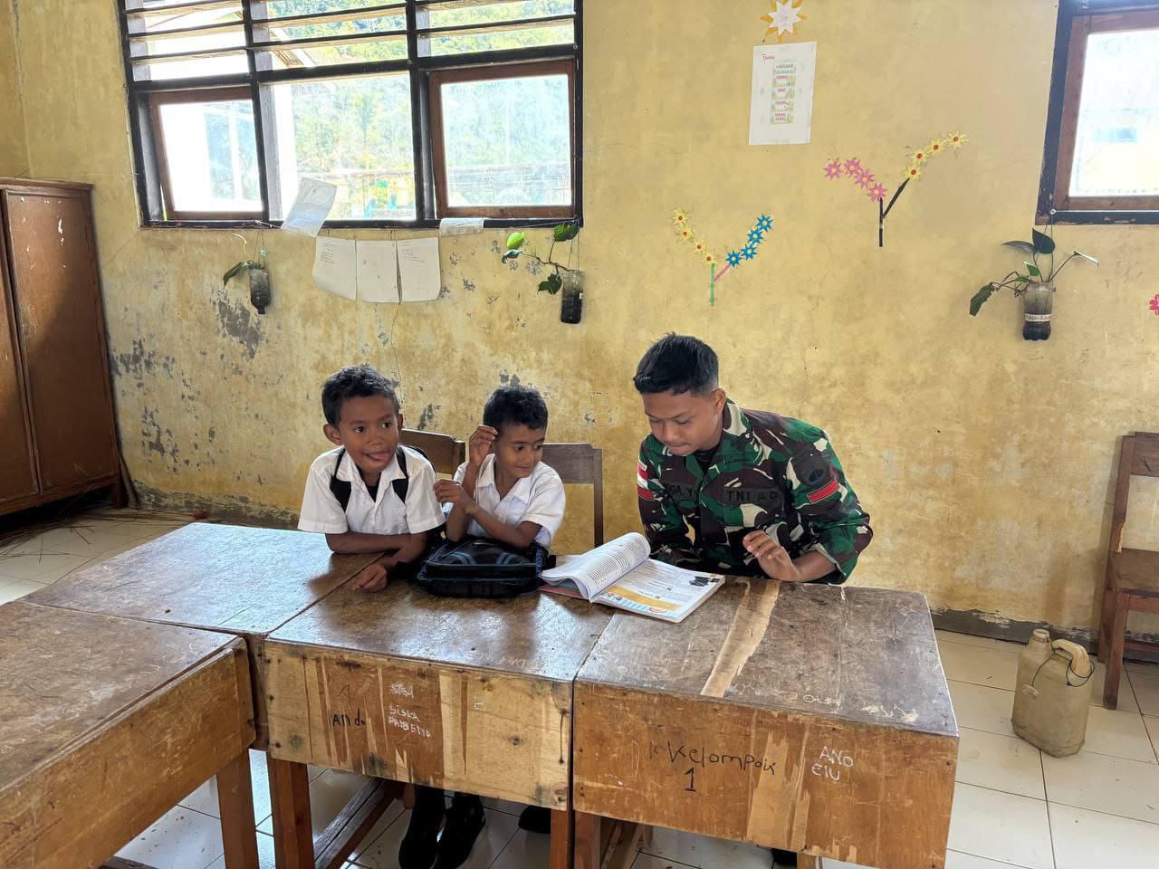 klivetvindonesia.com– Kecamatan Bikomi Nilulat, 9 September 2025 – Dalam upaya meningkatkan pendidikan dan memberikan pengetahuan kepada generasi muda, personel Satgas Pamtas RI-RDTL Sektor Barat Yonarhanud 15/DBY dari Pos Nilulat, yang dipimpin oleh Pratu Nurhamid, melaksanakan kegiatan pendidikan di Sekolah Dasar Kristen (SDK) Nilulat. (8/9).