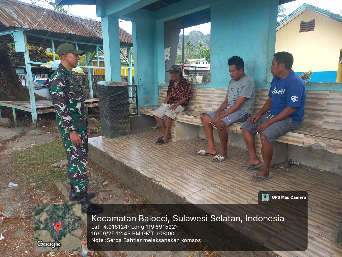 klivetvindonesia.com,Pangkep – Selasa, 16 September 2025, pukul 12.20 WITA, Babinsa Kelurahan Balleangin, Serda Bahtiar, melaksanakan kegiatan komunikasi sosial (Komsos) bersama warga di Kampung Tompo Balang, Kelurahan Balleangin, Kecamatan Balocci, Kabupaten Pangkep. Kegiatan ini merupakan bagian dari tugas rutin Babinsa dalam menjalin kedekatan dengan masyarakat sekaligus memberikan arahan terkait kehidupan bermasyarakat.