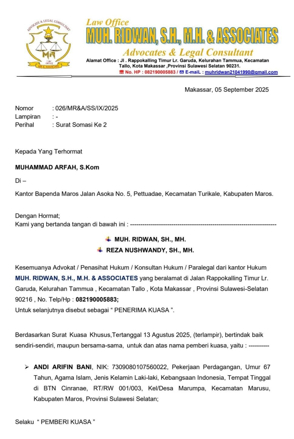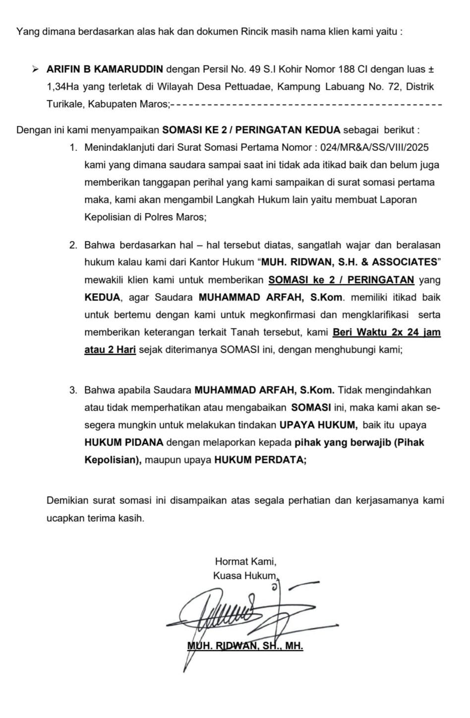 Dalam surat resmi, kuasa hukum menegaskan bahwa hingga kini saudara Muhammad Arfah tidak pernah memberikan klarifikasi sejak Somasi Pertama pada Agustus 2025 lalu.