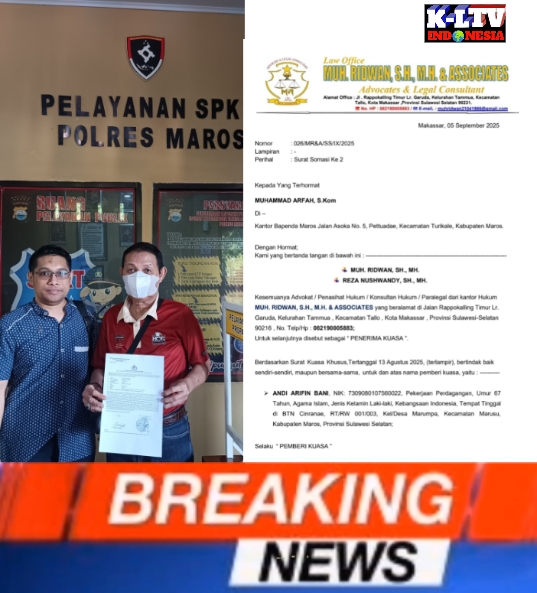 –klivetvindonesia.com– Maros, 17 September 2025 — Sengketa kepemilikan tanah di Kabupaten Maros kembali memanas setelah pemilik sah melayangkan Surat Somasi Kedua kepada Muhammad Arfah, S.Kom., Galla Labuang Kelurahan Pettuadae yang juga tercatat sebagai pegawai Badan Pendapatan Daerah (Bapenda) Kabupaten Maros, usai dilantik beberapa waktu lalu.
