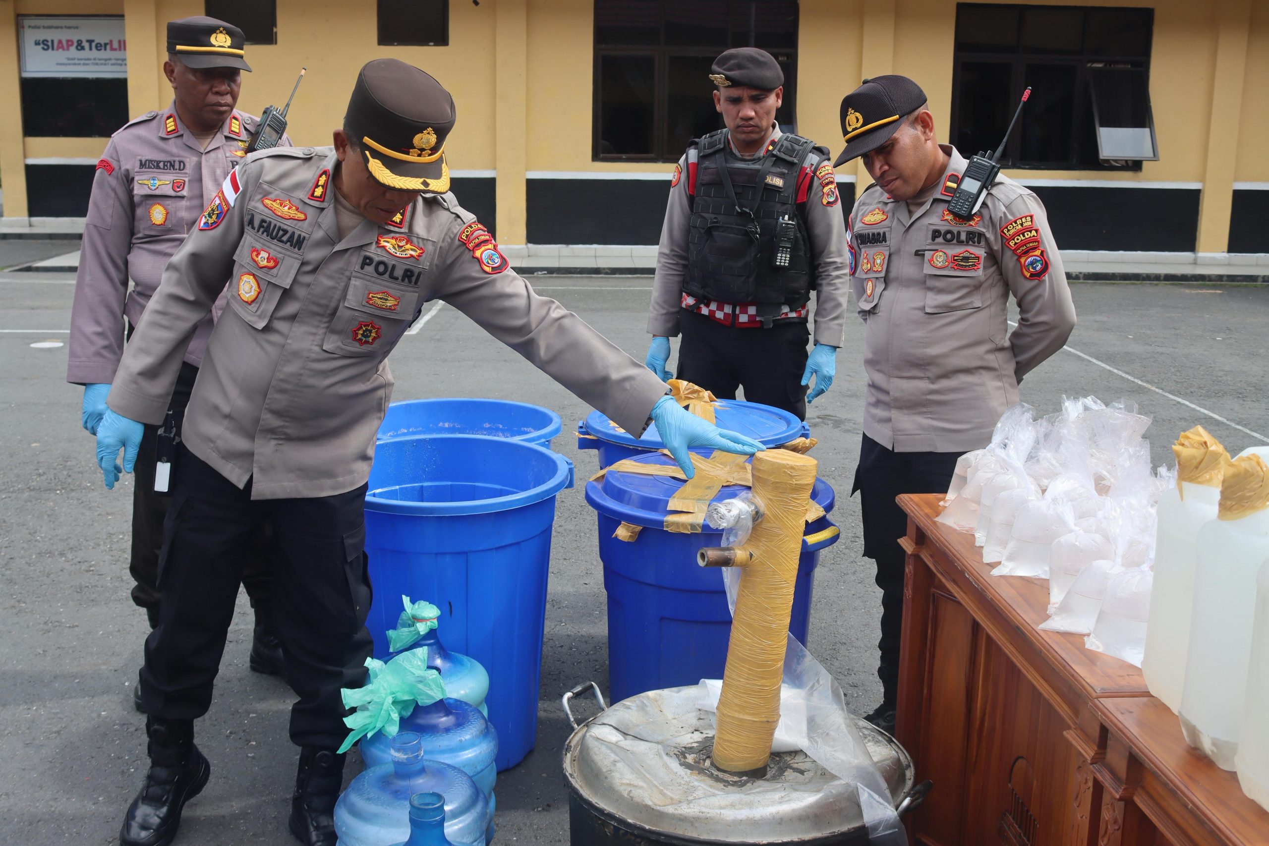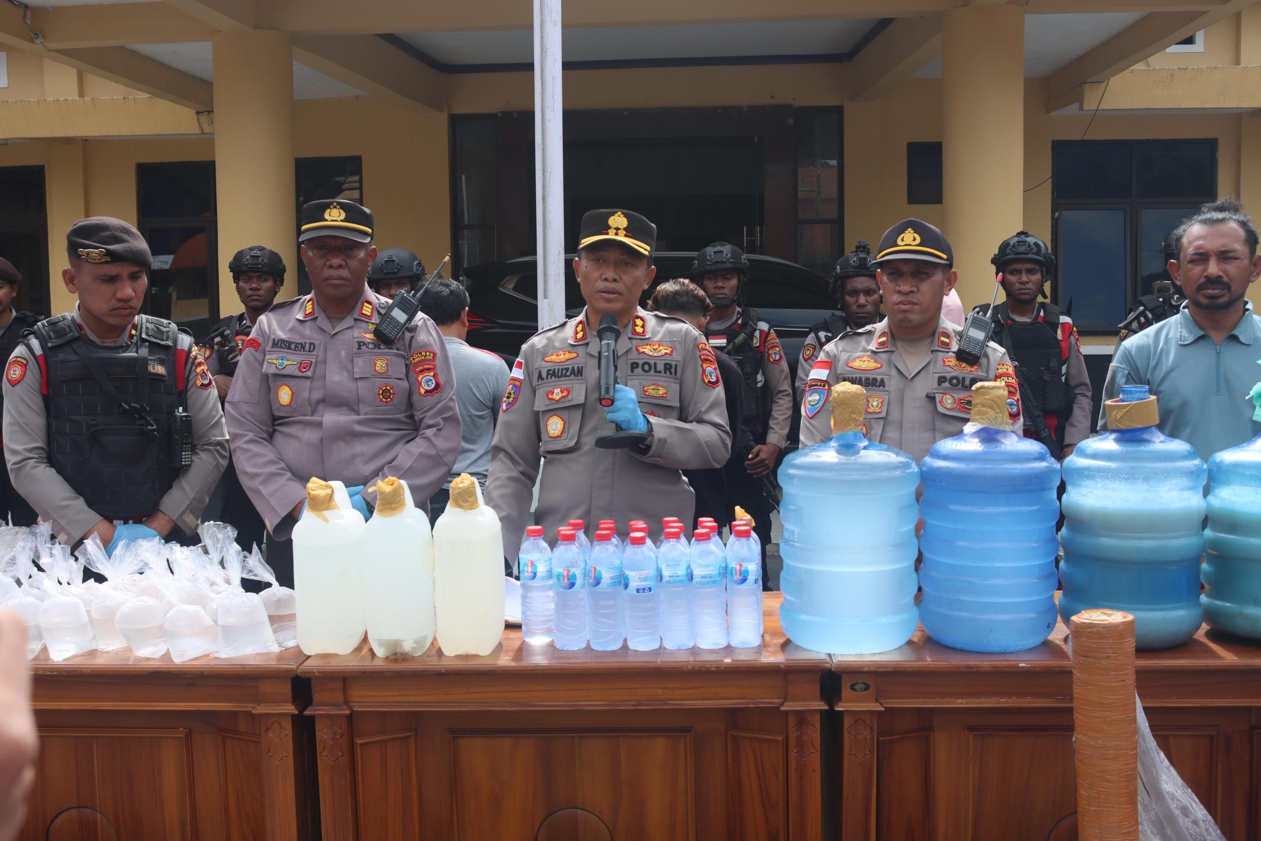 Dalam pemaparannya, Kapolres mengungkapkan rincian barang bukti yang berhasil disita. Dari tersangka pertama, diamankan 235 liter bahan baku dan 50 liter miras siap edar. Tersangka kedua kedapatan menyimpan 180 liter bahan baku serta 25 liter miras oplosan. Sementara tersangka ketiga menyimpan 225 liter bahan baku dan 35 liter miras siap edar.
