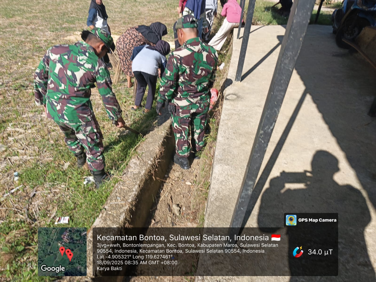 klivetvindonesia.com,Balocci, Pangkep – Wujud kepedulian TNI terhadap lingkungan dan kesehatan masyarakat kembali ditunjukkan oleh jajaran Koramil 1421-01/Balocci. Pada Kamis, 18 September 2025, pukul 08.00 Wita, personel Koramil bersama staf Kelurahan Tonasa serta masyarakat setempat melaksanakan kegiatan karya bakti pembersihan pekuburan dan parit sepanjang kurang lebih 300 meter di Kampung Wirsal (Wiring Salo) Majennang, RT 03/RW 05, Kelurahan Tonasa, Kecamatan Balocci, Kabupaten Pangkep.
