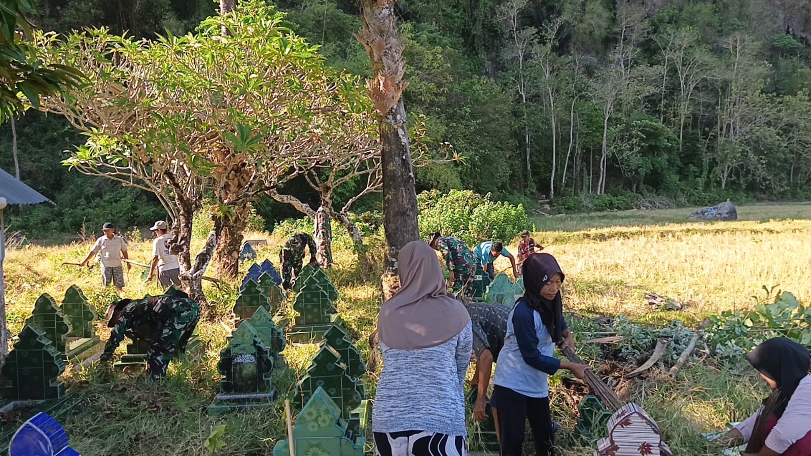 Pembersihan yang dilakukan secara gotong royong berjalan penuh semangat. Warga bersama personel TNI tampak bahu-membahu membersihkan area pekuburan dari rumput liar dan sampah, sekaligus menata parit agar aliran air menjadi lancar. Hal ini diharapkan dapat mencegah terjadinya genangan yang berpotensi menimbulkan penyakit, sekaligus menjaga kebersihan dan kenyamanan lingkungan.