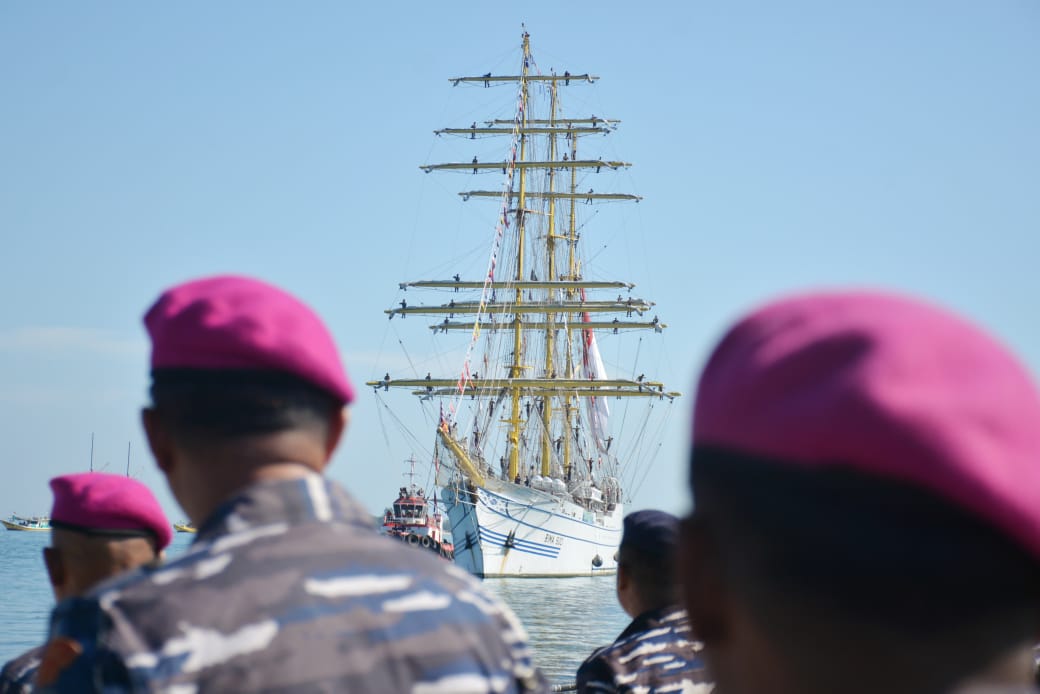 Penyambutan berlangsung penuh khidmat sekaligus meriah. Para prajurit berjajar rapi, memperlihatkan sikap hormat dan kebanggaan atas hadirnya generasi muda calon perwira TNI Angkatan Laut. Kedatangan kapal latih layar terbesar milik TNI AL ini sekaligus menjadi momentum memperkuat semangat kebaharian di Makassar, salah satu kota maritim penting di Indonesia timur.