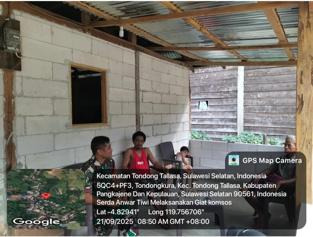 Pangkep – Babinsa terus menunjukkan perannya sebagai garda terdepan TNI dalam menjaga kedekatan dengan masyarakat di wilayah binaan. Pada Minggu (21/9/2025) pukul 08.40 Wita, Serda Anwar Tiwi, Babinsa Desa Tondongkura, melaksanakan kegiatan komunikasi sosial (Komsos) bersama masyarakat di Dusun Ujung Bassi, Desa Tondongkura, Kecamatan Tondong Tallasa, Kabupaten Pangkep.