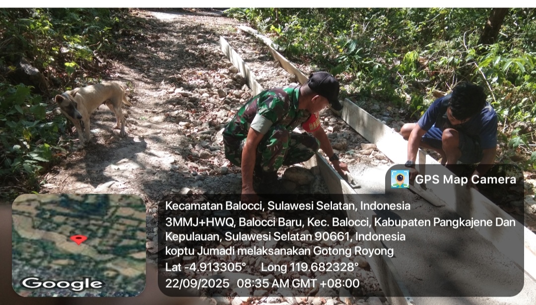 klivetvindonesia.com,Balocci, Pangkep – Semangat kebersamaan dan kepedulian terhadap lingkungan kembali ditunjukkan oleh masyarakat Kelurahan Balocci Baru. Pada Senin (22/9/2025) pukul 07.30 WITA, Koptu Jumadi, Babinsa Kelurahan Balocci Baru, turun langsung mendampingi warga dalam kegiatan gotong royong pengecoran jalan di Kampung Bonti, RK 005, RT 001 dan RT 002, Kelurahan Balocci Baru, Kecamatan Balocci, Kabupaten Pangkep.