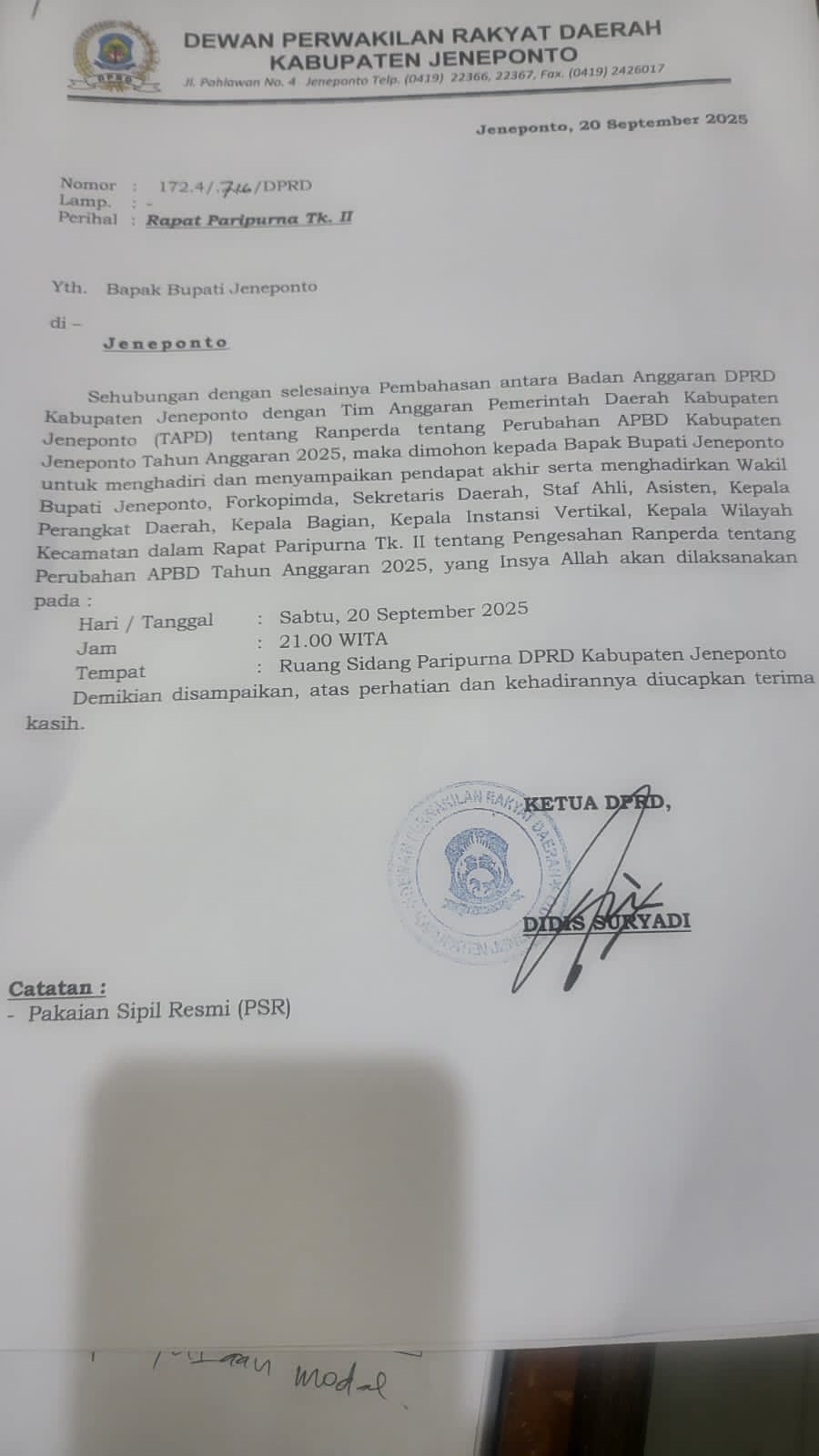Ketua DPRD Jeneponto, Didis Suryadi, dalam surat resminya mengundang Bupati Jeneponto untuk hadir menyampaikan pendapat akhir serta menghadirkan Wakil Bupati, Forkopimda, Sekretaris Daerah, Staf Ahli, Asisten, Kepala OPD, camat, hingga pimpinan instansi vertikal.