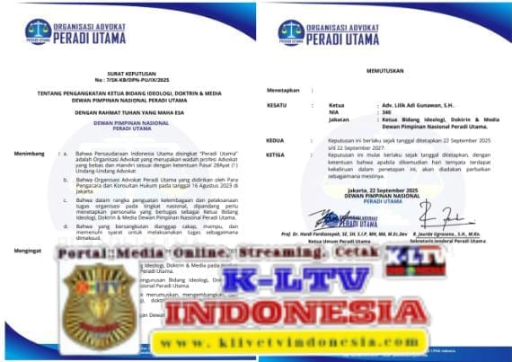 klivetvindonesia.com, Adv.Lilik Adi Gunawan, S.H, mendapatkan tugas dan tanggung jawab dari Ketua Umum Peradi Utama Prof.Dr.Hardi Fardiamsyah, S.E.,S.H., S.I.P., M.H., MA.,M.Ec.Dev, berdasarkan SURAT KEPUTUSAN No.7/SK-KB/DPN-PU/IX/2025 sebagai Ketua Bidang Ideologi, Doktrin & Media Dewan Pimpinan Nasional Peradi Utama sejak tanggal 22 September 2025 s/d 22 September 2027.