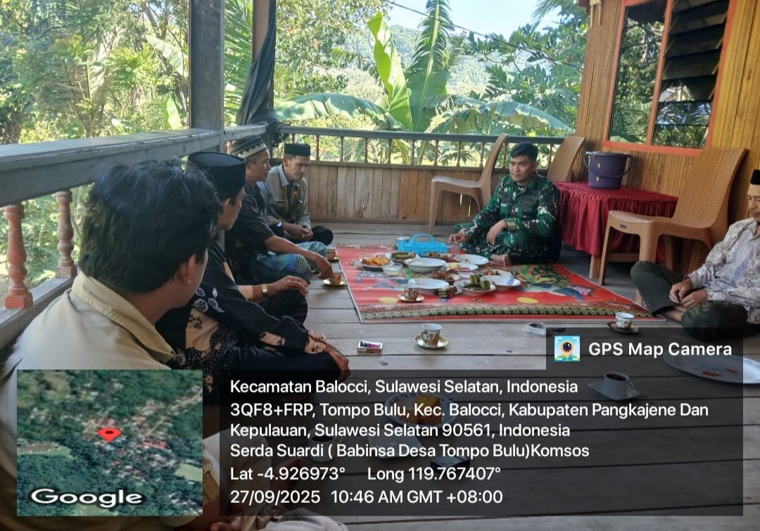 PANGKEP-KLTV INDONESIA klivetvindonesia.com,Pangkep – Dalam rangka mempererat hubungan silaturahmi sekaligus menjaga kondusifitas wilayah binaan, Babinsa Desa Tompo Bulu, Koramil 1421-01/Balocci, Serda Suardi melaksanakan kegiatan Komunikasi Sosial (Komsos) bersama Kepala Dusun 03 Tanete dan masyarakat setempat. Kegiatan tersebut berlangsung pada hari Sabtu, 27 September 2025, sekitar pukul 10.25 Wita, bertempat di rumah Bapak Budi Permana, Kampung Tanete, Desa Tompo Bulu, Kecamatan Balocci, Kabupaten Pangkajene dan Kepulauan.