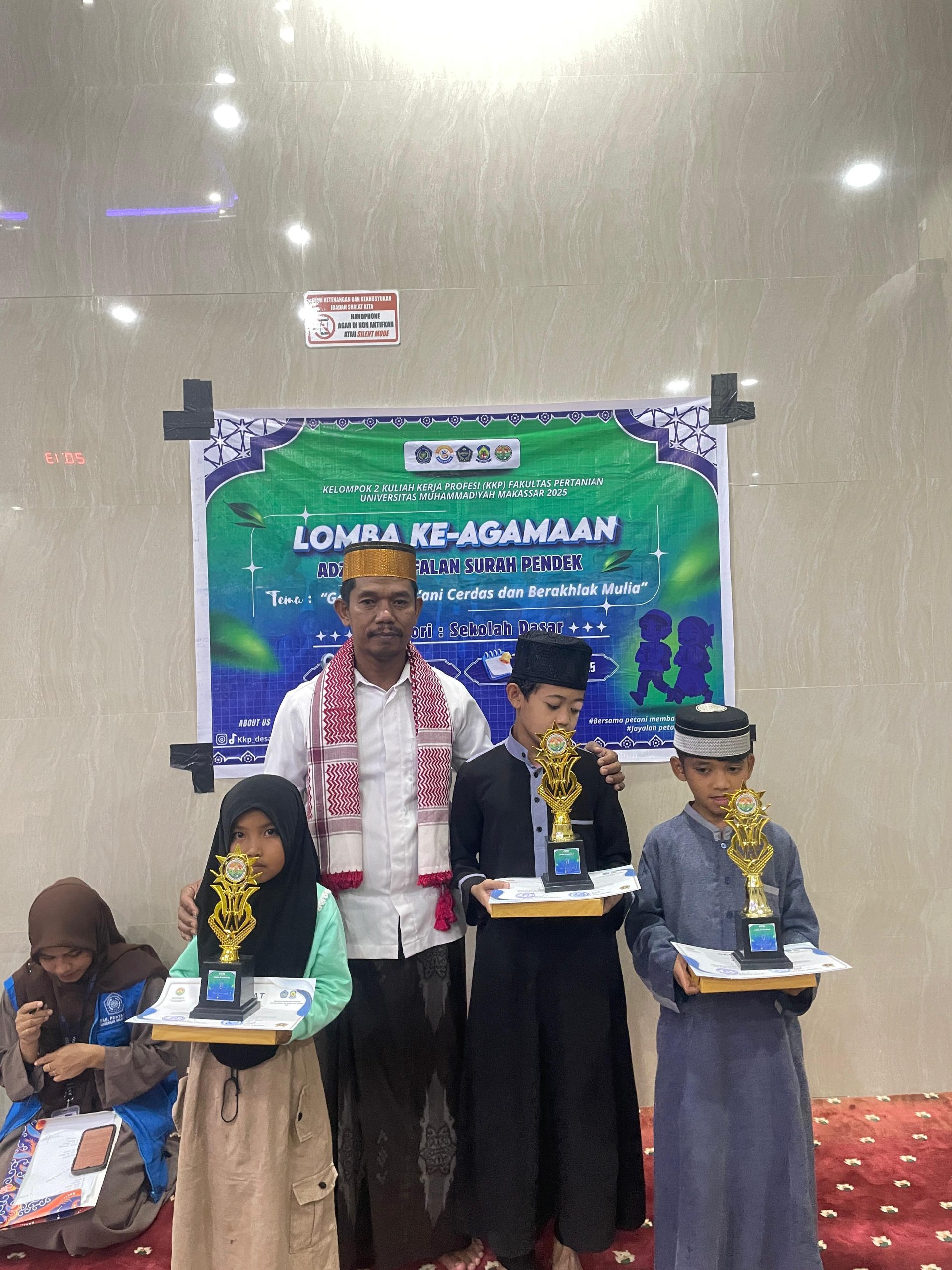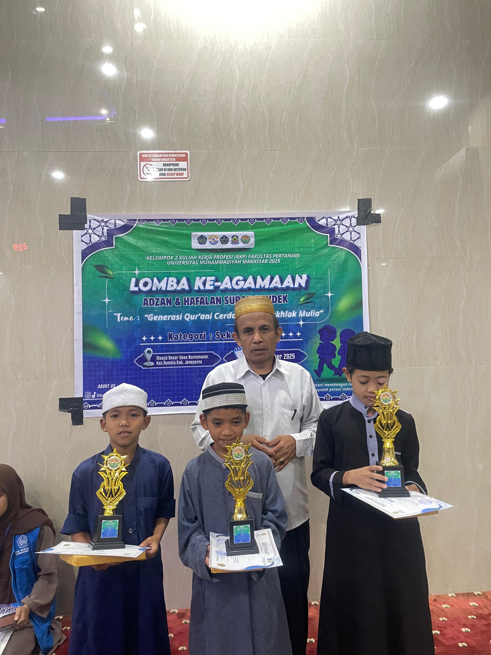 Mahasiswa Kuliah Kerja Profesi (KKP), Universitas Muhammadiyah Makassar, kelompok tingkat sekolah dasar mengikuti kegiatan perlombaan di Masjid Besar nurul jannah Desa Bontomanai, Kecamatan Rumbia, Kabupaten Jeneponto.