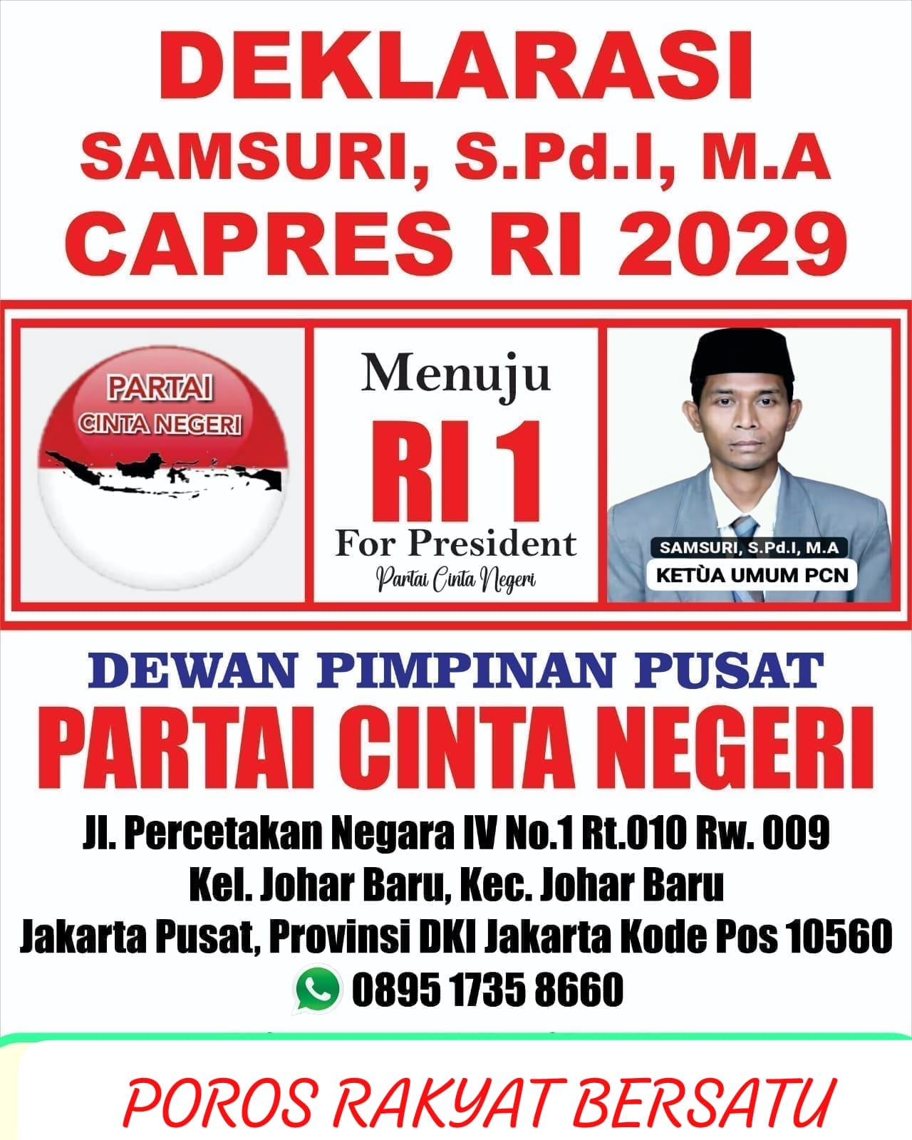 DEKLARASI SAMSURI, S.Pd.I, M.A ( KETUA UMUM PARTAI CINTA NEGERI ) SEBAGAI CALON PRESIDEN REPUBLIK INDONESIA PERIODE 2029 – 2034.