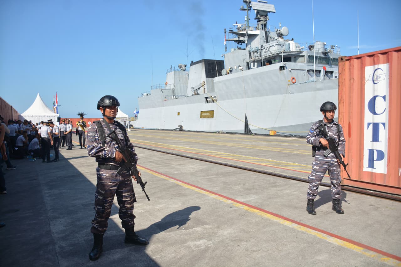 TNI AL, Dispen Kormar (Makassar) — Prajurit Yonmarhanlan VI Makassar melaksanakan tugas pengamanan kunjungan kapal perang INS KADMATT P-29 milik Angkatan Laut India yang bersandar di Pelabuhan Soekarno Hatta, Makassar, Jumat (03/10/2025).