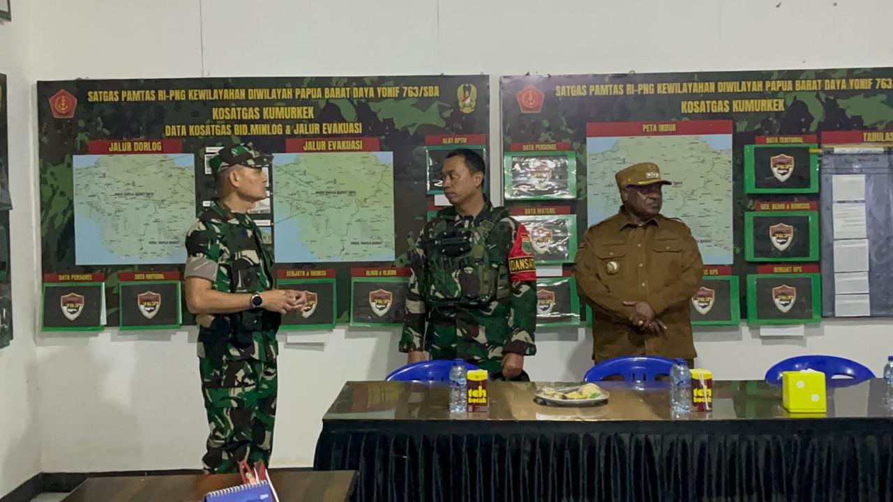 Maybrat, Papua Barat Daya — Komandan Korem 181/PVT Brigjen TNI Slamet Riadi, S.I.P., selaku Dankolakops Satgas melaksanakan kunjungan kerja ke Pos Kumurkek Satgas Pamtas RI-PNG Kewilayahan Yonif 763/SBA. (11/10/2025).