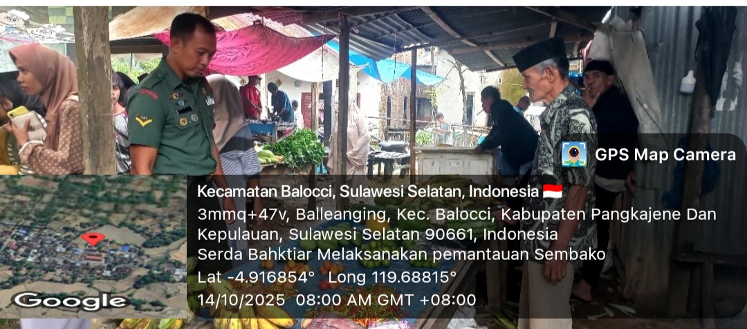 klivetvindonesia.com,Pangkep, Sulsel — Dalam rangka menjaga stabilitas harga dan memastikan ketersediaan bahan pokok bagi masyarakat, Babinsa Kelurahan Balleangin, Kecamatan Balocci, Kabupaten Pangkajene dan Kepulauan (Pangkep), Serda Bahtiar, melaksanakan kegiatan pemantauan harga jual beli bahan pokok di Pasar Tradisional Balleangin pada Selasa, 14 Oktober 2025, pukul 08.30 Wita.