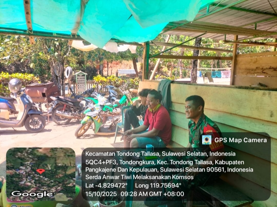 PANGKEP-KLTV INDONESIA klivetvindonesia.com,Pangkep, Rabu (15 Oktober 2025)– Dalam rangka mempererat hubungan dengan masyarakat dan menjaga situasi keamanan wilayah tetap kondusif, Babinsa Desa Tondongkura, Serda Anwar Tiwi, melaksanakan kegiatan Komunikasi Sosial (Komsos) bersama warga di Dusun Bonto Manai, Desa Tondongkura, Kecamatan Tondong Tallasa, Kabupaten Pangkep, pada Rabu, 15 Oktober 2025 pukul 09.25 Wita