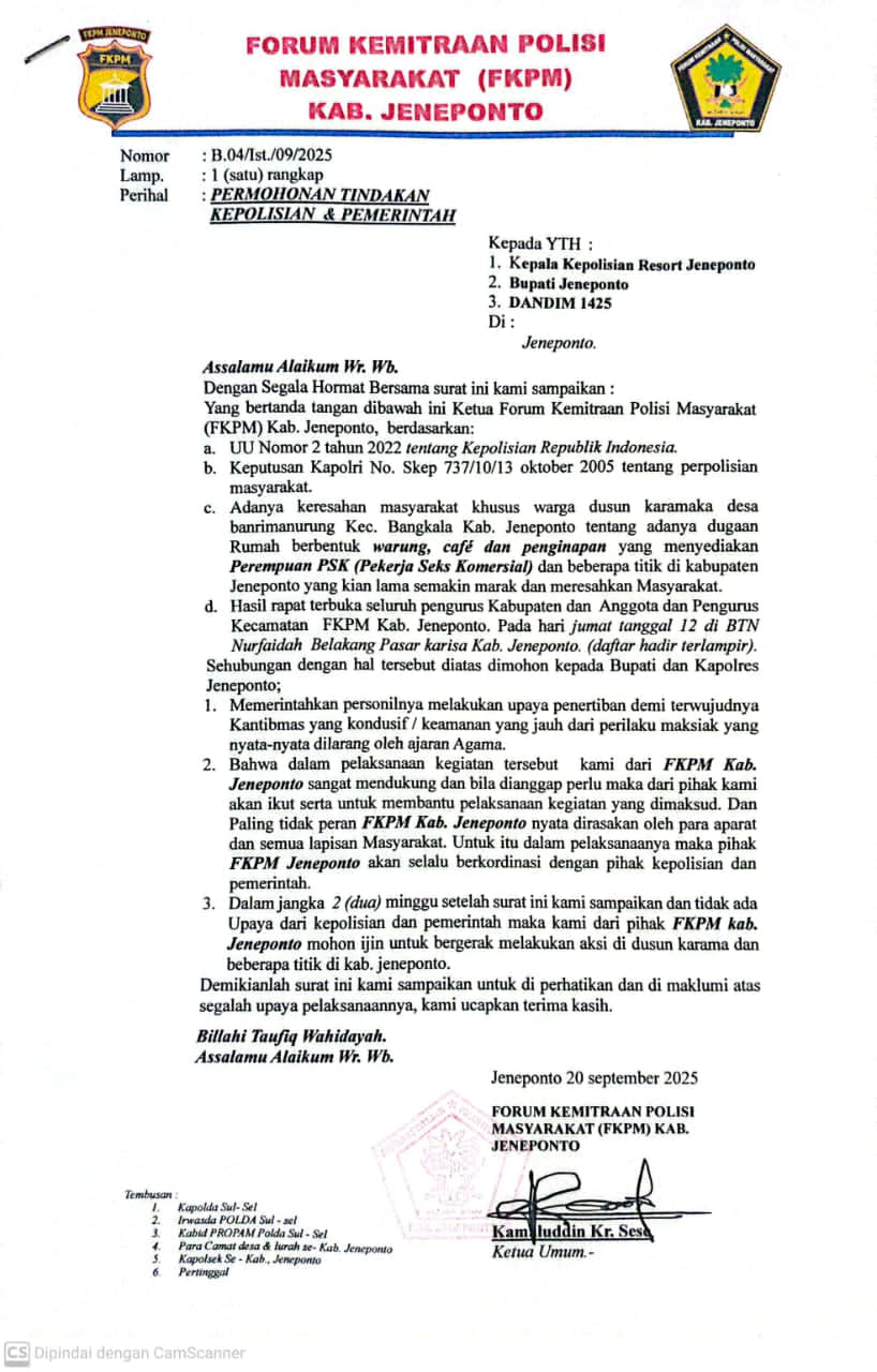Sementara itu, H. Anas Karaeng Kallana, selaku Dewan Penasehat FKPM Jeneponto, menegaskan bahwa lokalisasi di Karamaka telah menjadi perhatian utama FKPM sejak lama. Ia mengungkapkan bahwa pihaknya sudah melayangkan surat resmi kepada aparat penegak hukum dan pemerintah daerah untuk melakukan penertiban.