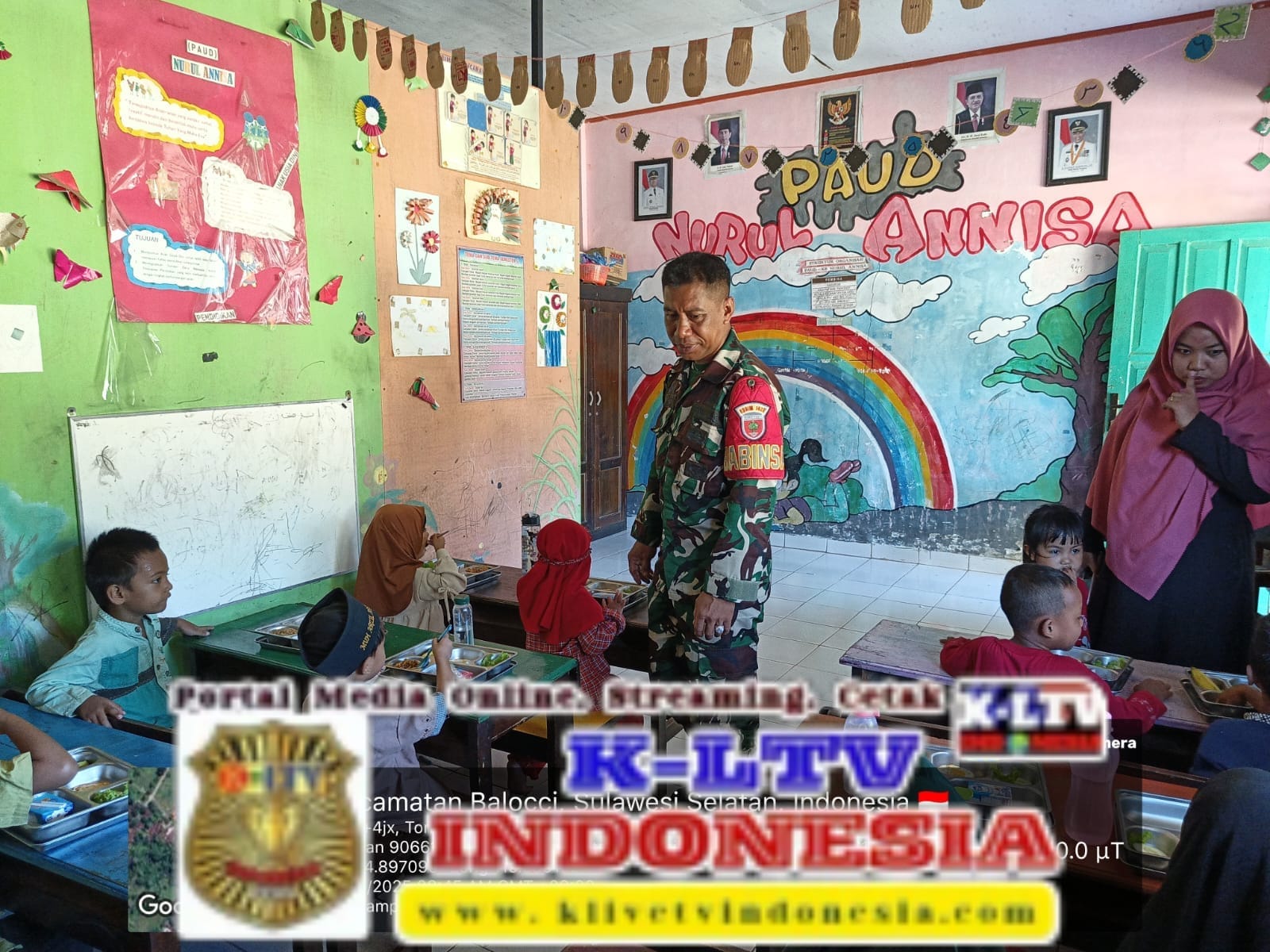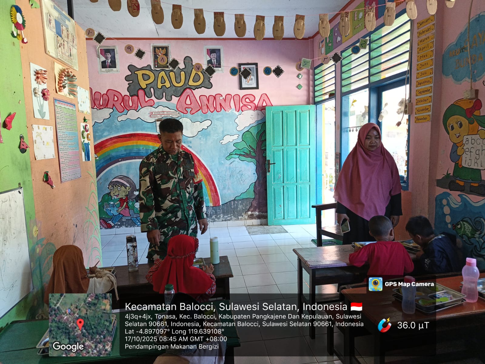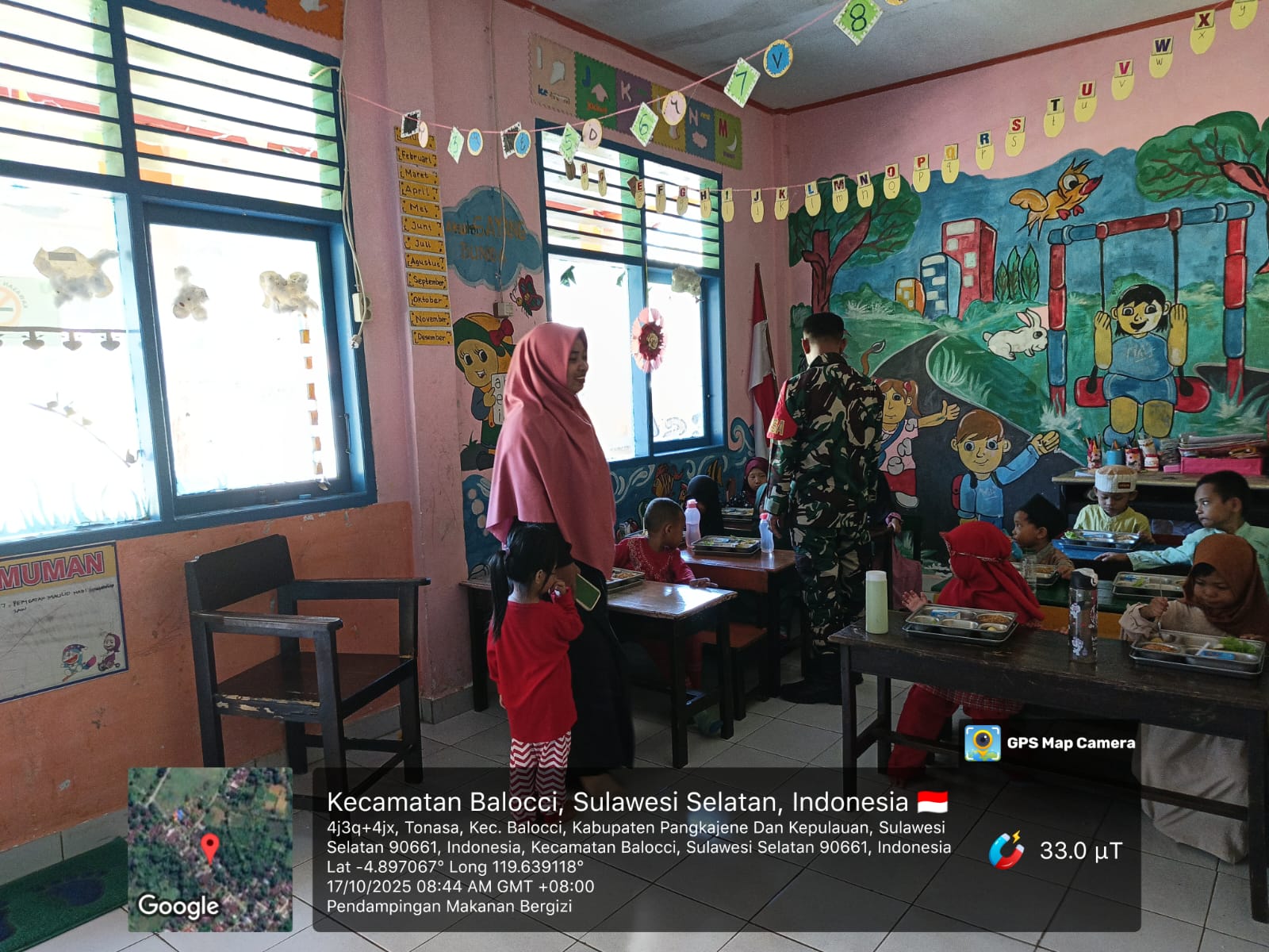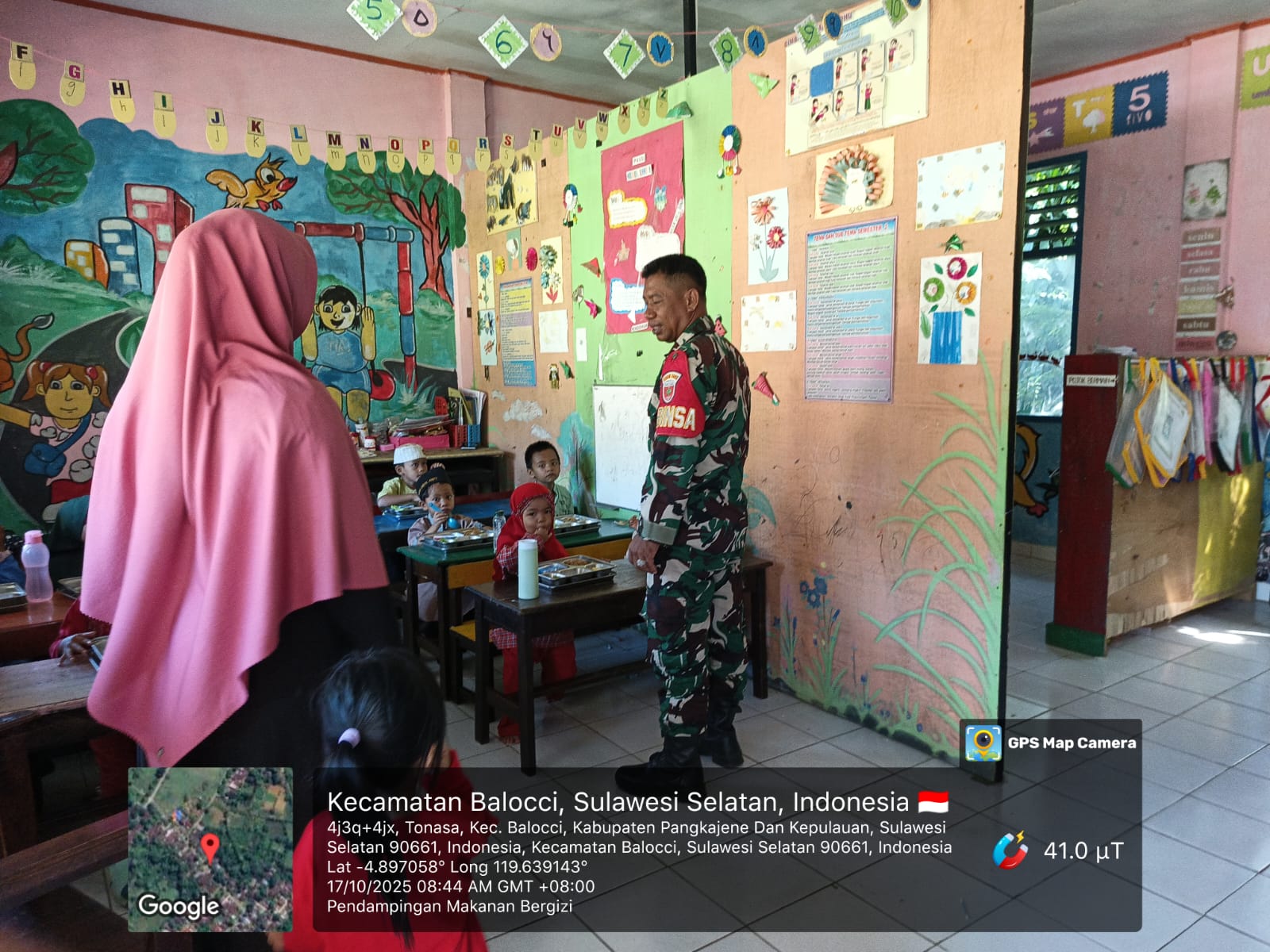 PANGKEP-KLTV INDONESIA klivetvindonesia.com,Pangkep, Kamis (17 Oktober 2025) – Dalam rangka mendukung program pemerintah tentang Makan Bergizi Gratis (MBG) bagi anak-anak sekolah, Babinsa Kelurahan Tonasa, Serda Suhardi, melaksanakan kegiatan pendampingan dan pemantauan pelaksanaan makan bergizi bagi siswa-siswi di PAUD/KB Nurul Annisa, yang berlokasi di Bultap, Kelurahan Tonasa, Kecamatan Balocci, Kabupaten Pangkep.