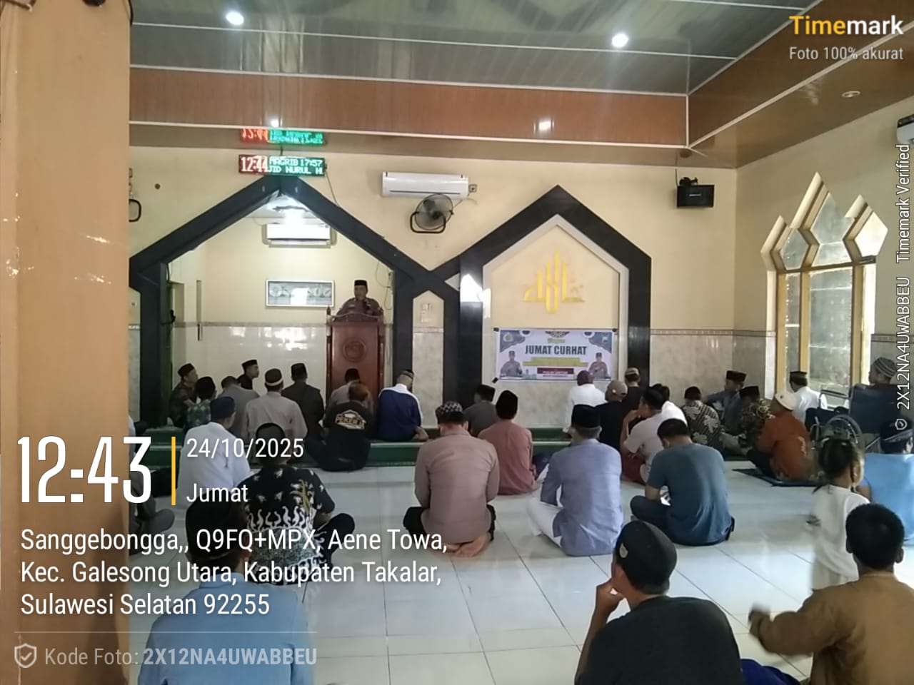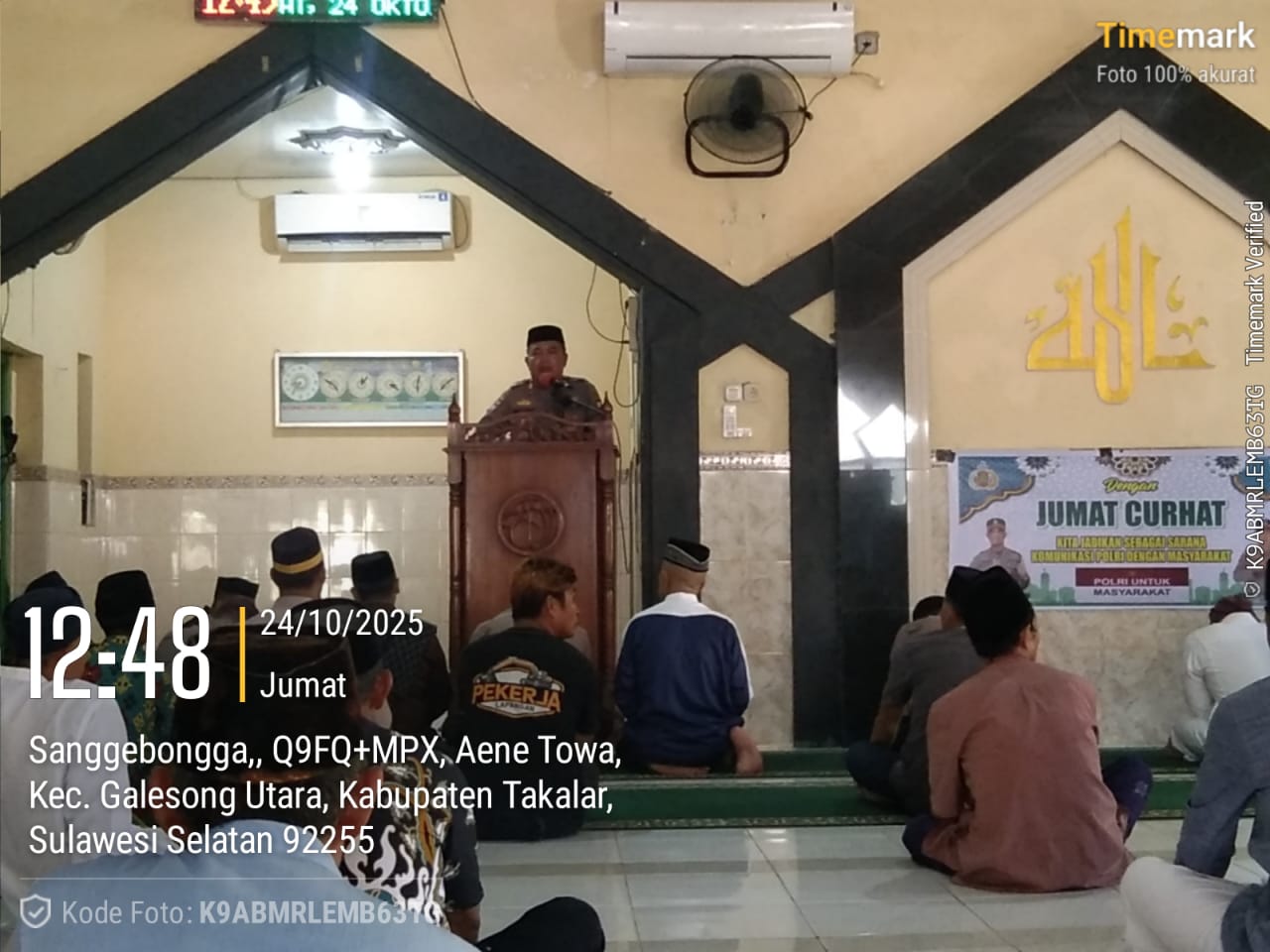klivetvindonesia.com,Takalar – Dalam rangka mempererat silaturahmi dan mendengar langsung aspirasi masyarakat, Polres Takalar melalui Kasat Binmas AKP Achmad Koembara, S.H., M.H. bersama Kapolsek Galut IPTU Agusalim Gama, S.H. melaksanakan kegiatan Jumat Curhat di Masjid Nurul Huda, Dusun Sagge Bongga, Desa Aeng Towa, Kecamatan Galesong Utara, Kabupaten Takalar, Jumat (24/10/2025) sekitar pukul 12.00 Wita.