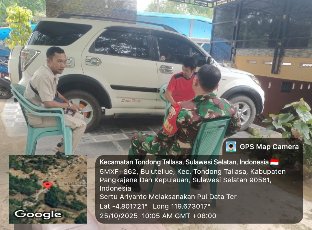 klivetvindonesia.com,Pangkep, Sabtu (25/10/2025) — Dalam upaya mempererat hubungan silaturahmi dan memperkuat kemanunggalan antara TNI dengan masyarakat, Babinsa Desa Bulu Tellue, Sertu Ariyanto, melaksanakan kegiatan Komunikasi Sosial (Komsos) bersama warga di rumah Bapak Tajuk, bertempat di Kampung Libureng, RT 01, RK 03, Desa Bulu Tellue, Kecamatan Tondong Tallasa, Kabupaten Pangkep, pada pukul 09.00 Wita.
