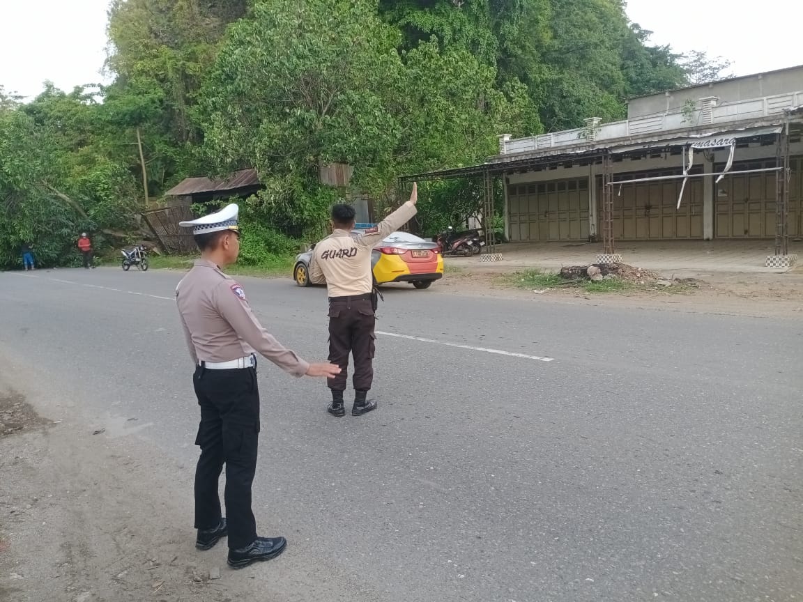 Panit 1 Lalu Lintas Polsek Bungoro IPDA Mat Faesal, S.H., yang turun langsung ke lokasi untuk mengamankan arus kendaraan, menjelaskan bahwa pohon tersebut tumbang bukan karena faktor cuaca ekstrem.