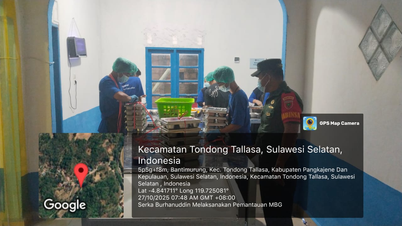Pemantauan ini dilakukan pada Senin pagi pukul 07.00 Wita di dapur yang dikelola oleh Yayasan Darul Barokah, yang menjadi pusat kegiatan memasak dan pengemasan makanan bergizi untuk anak-anak sekolah di wilayah Kecamatan Tondong Tallasa. Kegiatan tersebut merupakan bentuk sinergi antara TNI, pemerintah daerah, dan Satuan Pelayanan Pemenuhan Gizi (SPPG) Kabupaten Pangkep dalam memastikan bahwa proses penyediaan makanan berjalan tertib, aman, higienis, dan sesuai standar gizi yang ditetapkan pemerintah pusat.