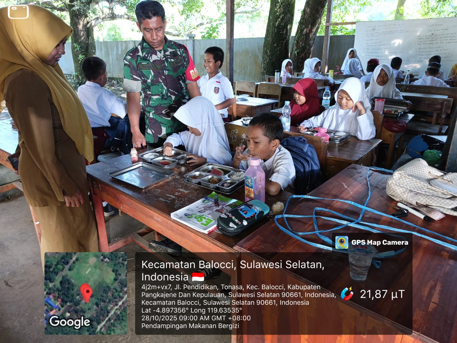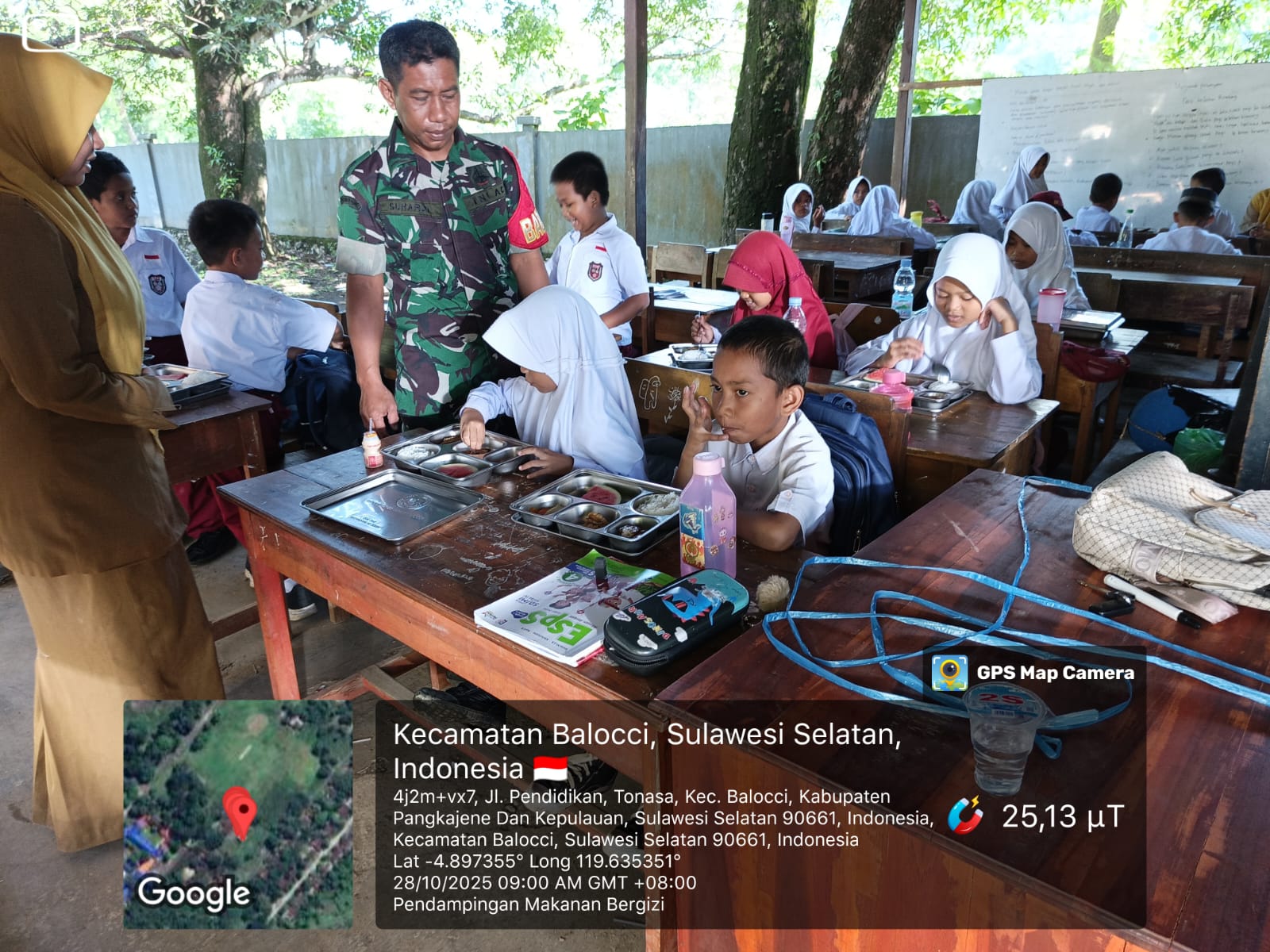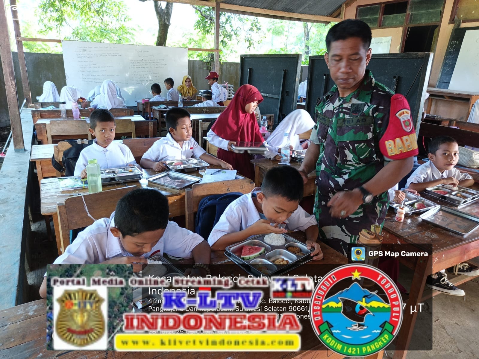 klivetvindonesia.com,Pangkep, Selasa (28/10/2025) — Dalam rangka mendukung dan mengawal suksesnya program nasional Makan Bergizi Gratis (MBG) yang diinisiasi oleh Presiden Republik Indonesia, Bapak Prabowo Subianto, Babinsa Kelurahan Tonasa Koramil 1421-01/Balocci, Serda Suhardi, melaksanakan kegiatan pendampingan dan pemantauan langsung pelaksanaan program tersebut di SDN 29 Tonasa 1, Kelurahan Tonasa, Kecamatan Balocci, Kabupaten Pangkep.