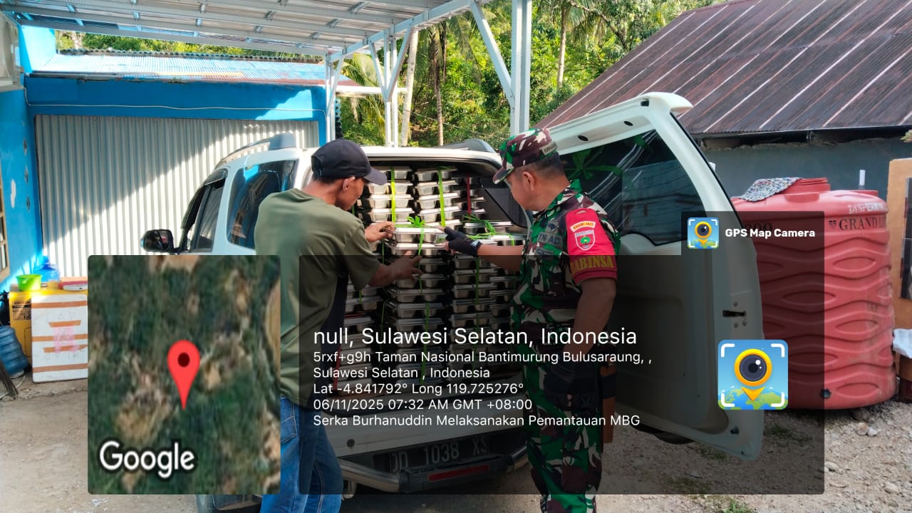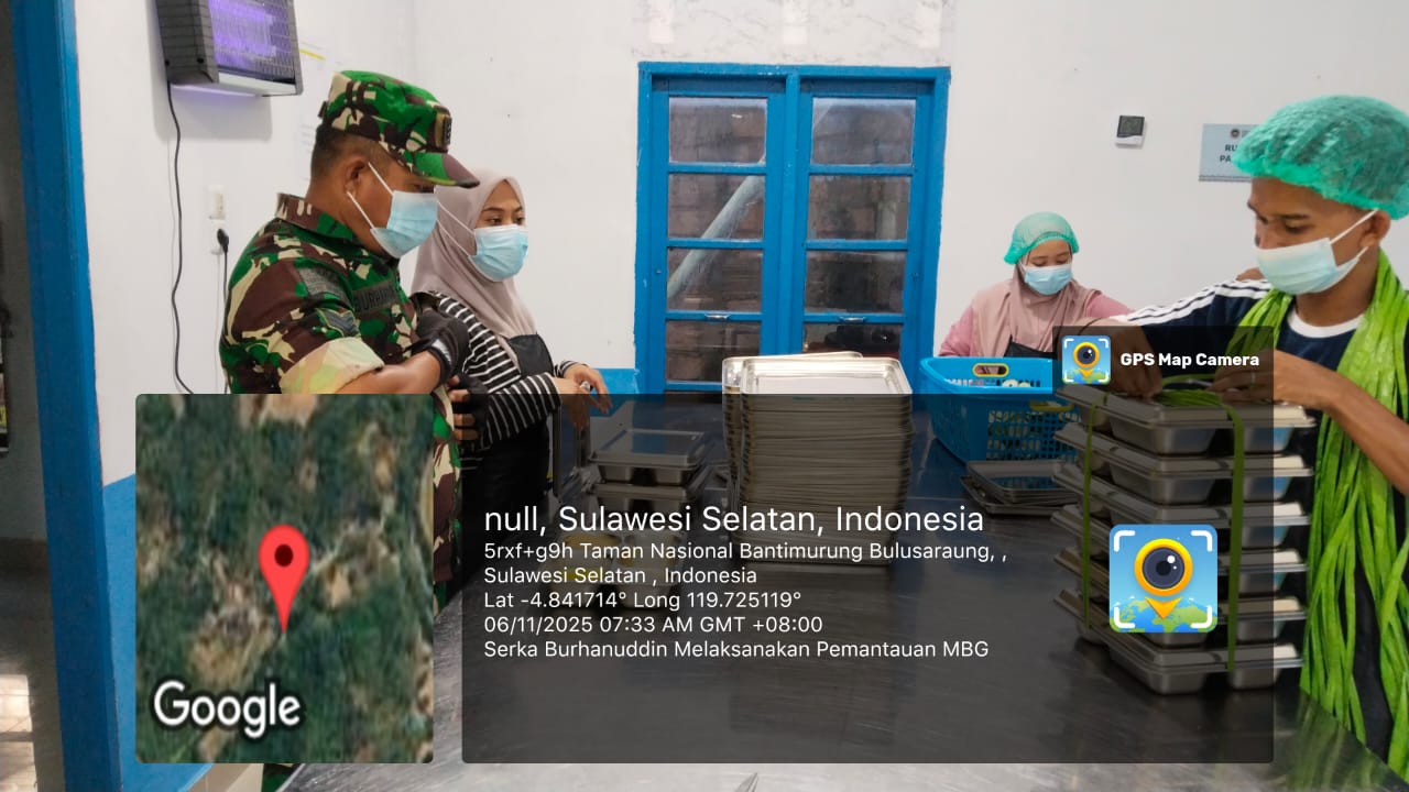 klivetvindonesia.com,Pangkep Dalam rangka mendukung dan memastikan kelancaran Program Makan Bergizi Gratis (MBG) yang merupakan salah satu program prioritas Presiden Republik Indonesia, Bapak Prabowo Subianto, Babinsa Desa Bantimurung, Serka Burhanuddin dari Koramil 1421-01/Balocci melaksanakan kegiatan Pemantauan Proses Penyiapan Dapur Sehat MBG pada hari Kamis, 06 November 2025, pukul 07.00 WITA.