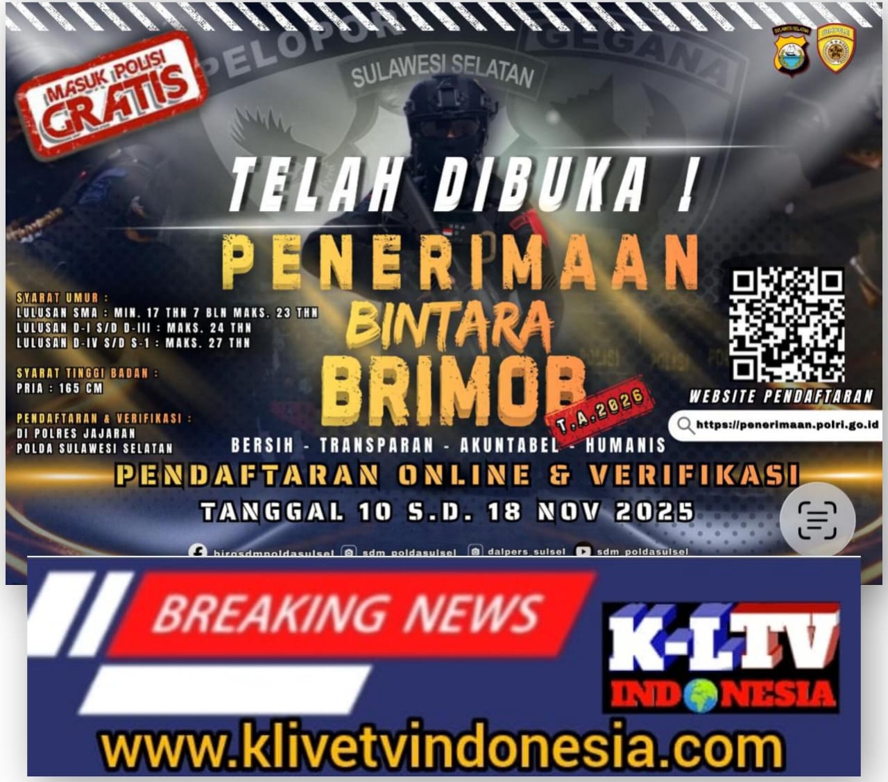 kltv.indonesia.com.Maros – Kepolisian Negara Republik Indonesia kembali membuka kesempatan bagi generasi muda untuk bergabung sebagai anggota Polri melalui penerimaan Bintara Brimob Tahun Anggaran 2026. Rekrutmen ini menjadi salah satu upaya strategis Polri dalam memperkuat sumber daya manusia, khususnya di bidang Brigade Mobil (Brimob), yang dikenal memiliki peran penting dalam menjaga stabilitas keamanan dan ketertiban di seluruh wilayah Indonesia.
