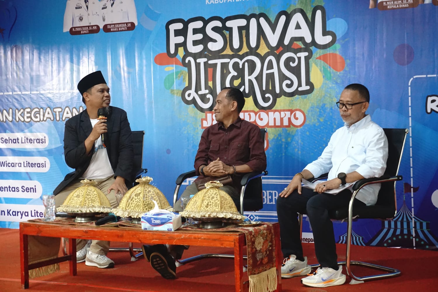 Dalam sesi diskusi yang dipandu oleh Haerullah Lodji, hadir dua narasumber utama: Dr. Bahtiar Adnan Kusuma, tokoh literasi nasional, dan Prof. Muhlis Hadrawi, akademisi dan pemerhati sastra Sulawesi Selatan.