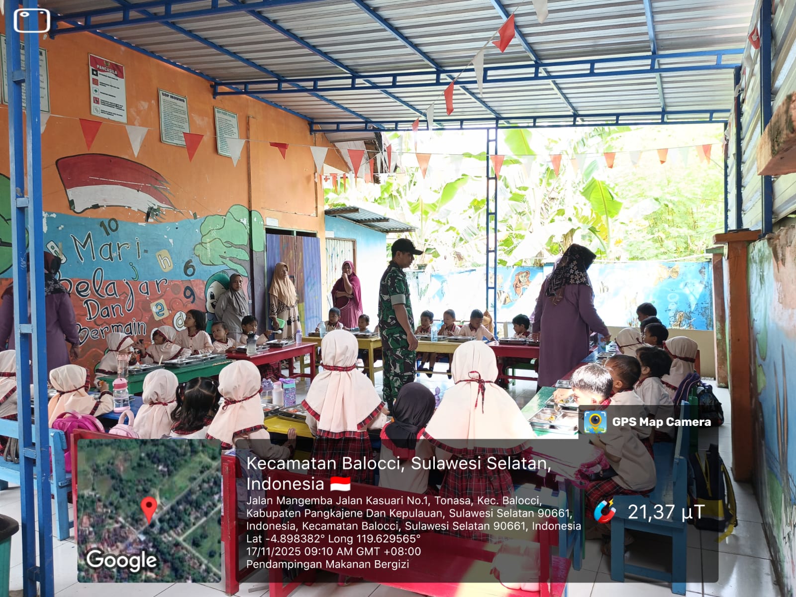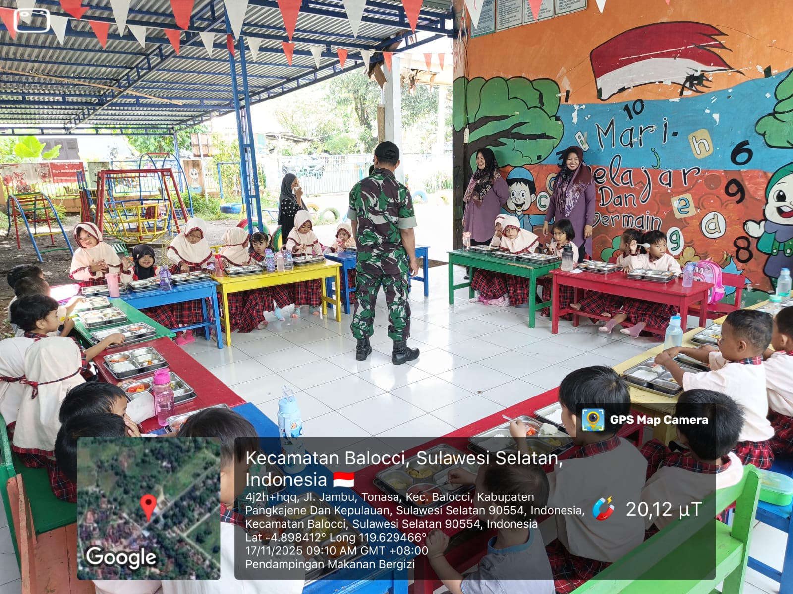 Pangkep, Sulawesi Selatan – Dalam upaya mendukung tumbuh kembang optimal anak-anak usia dini, Serda Suhardi, Babinsa Kelurahan Tonasa, aktif mendampingi pelaksanaan program Makan Bergizi Gratis (MBG) di PAUD/KB Nurul Jaman Majennang Tonasa 1, Kelurahan Tonasa, Kecamatan Balocci, Kabupaten Pangkep. Kegiatan ini berlangsung pada Senin, 17 November 2025, mulai pukul 09:00 WITA.