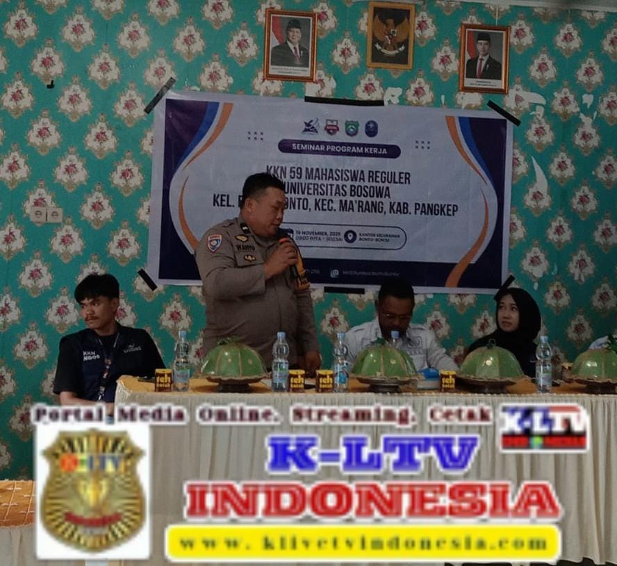 klivetvindonesia.com,Ma’rang. Dalam rangka mendukung kelancaran pelaksanaan kegiatan akademik di wilayah Kelurahan binaannya, Bhabinkamtibmas Kel.Bonto-Bonto Aipda Wahyuddin menghadiri kegiatan seminar program Kuliah Kerja Nyata (KKN) yang dilaksanakan oleh mahasiswa Universitas Bosowa(UNIBOS) Rabu (19/11/2025).Pagi