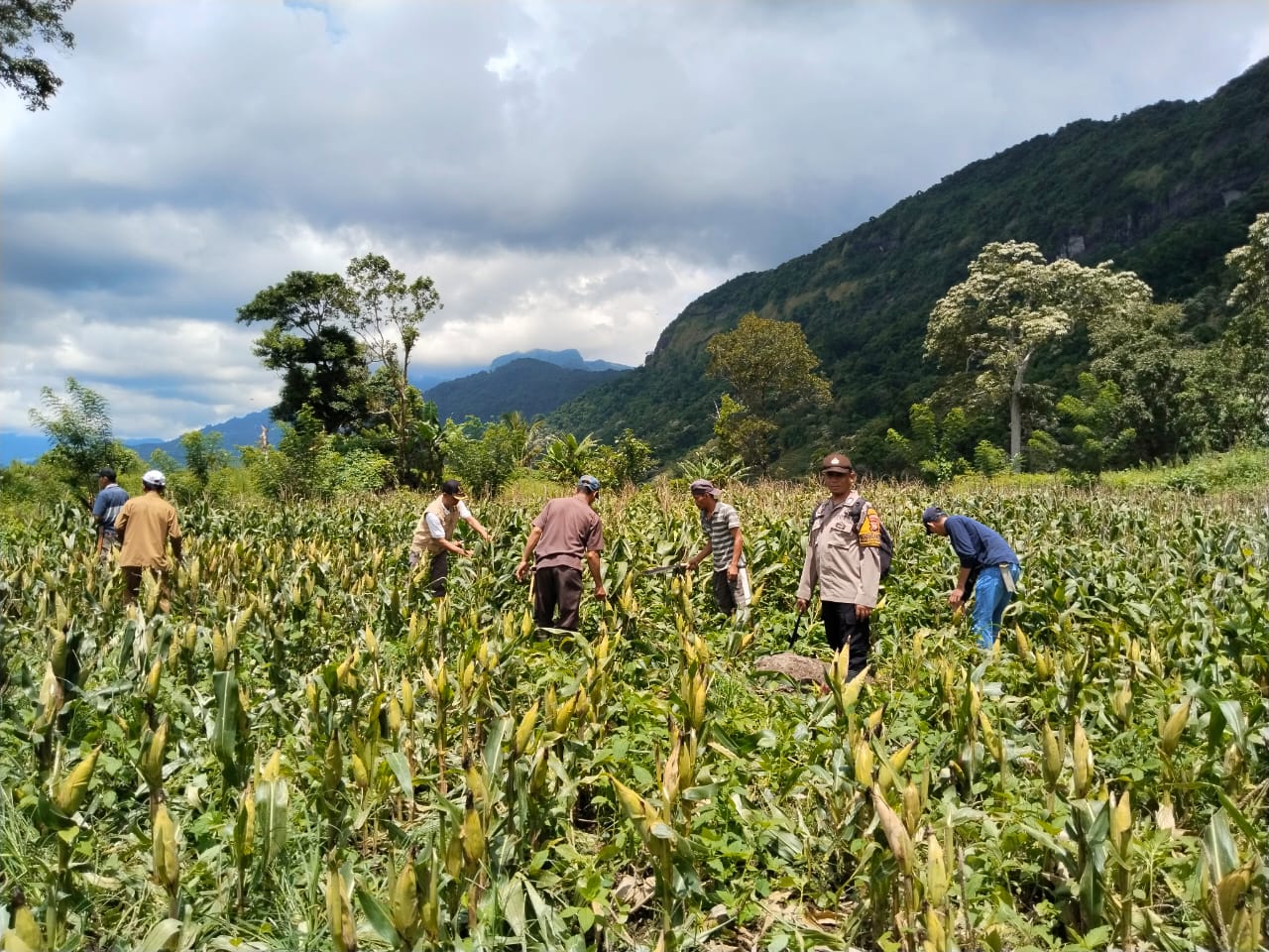 Luas lahan yang ditananami jagung kurang lebih satu hektar, kepala desa dan jajarannya Bhabinkamtibmas yang berada di kebun warga membantu memotong batang jagung sebagai suatu proses untuk segera dilakukan panen di waktu dekat.