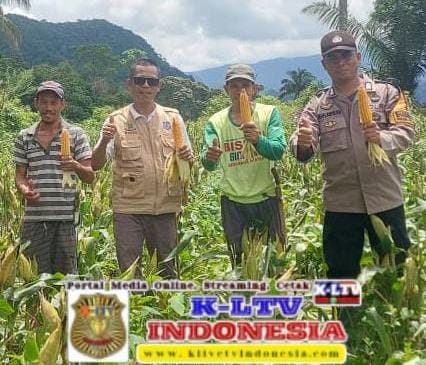 Luas lahan yang ditananami jagung kurang lebih satu hektar, kepala desa dan jajarannya Bhabinkamtibmas yang berada di kebun warga membantu memotong batang jagung sebagai suatu proses untuk segera dilakukan panen di waktu dekat.