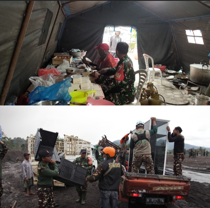 Untuk memperkuat respons di lapangan, Prajurit Divif 2 Kostrad mendirikan tenda peleton, dapur lapangan, serta memperkuat penyekatan di zona terdampak. Evakuasi barang berharga dan warga dilakukan secara terkoordinasi, didukung penuh oleh personel Koramil 0821-14/Pronojiwo yang sejak awal turut melakukan penyisiran dan pengamanan wilayah.