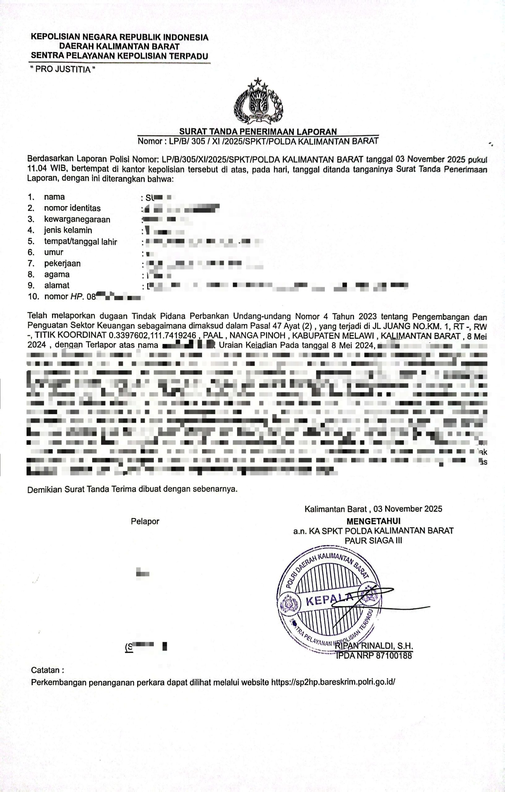 Perkara ini bermula ketika S melaporkan adanya penyalahgunaan data perbankannya ke Polda Kalbar pada 25 Juli 2024. Ia mengaku mengetahui bahwa print out rekening korannya diduga diperoleh dan dipergunakan oleh pihak lain tanpa mengikuti standar operasional prosedur (SOP) perbankan.