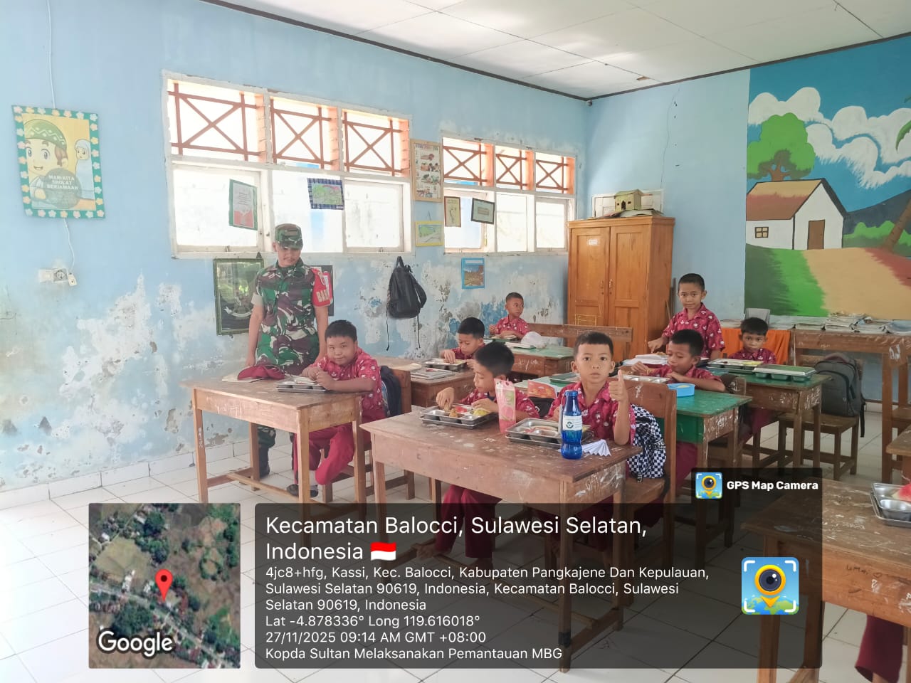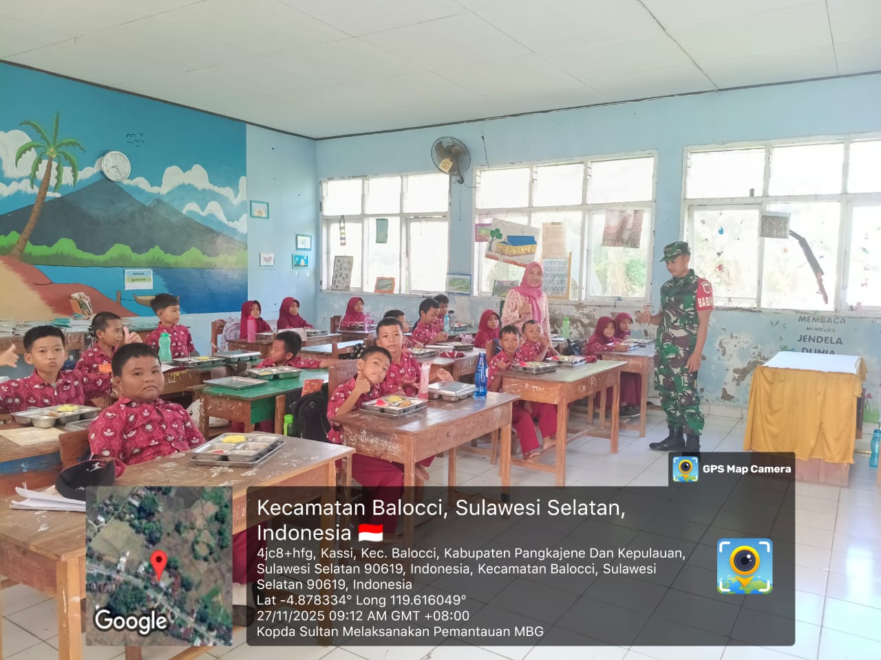 klivetvindonesia.com,Pangkep — Kegiatan pendampingan program Makan Bergizi Gratis (MBG) kembali dilaksanakan di wilayah Kecamatan Balocci. Pada hari Kamis, 27 November 2025, sekitar pukul 09.09 Wita, Kopda Sultan selaku Babinsa Desa Malaka hadir langsung di SD Negeri 1 Kassi, Kelurahan Kassi, Kecamatan Balocci, Kabupaten Pangkep, untuk memastikan kelancaran penyaluran santapan sehat bagi para siswa-siswi.
