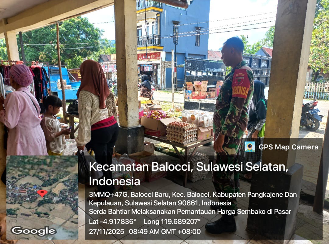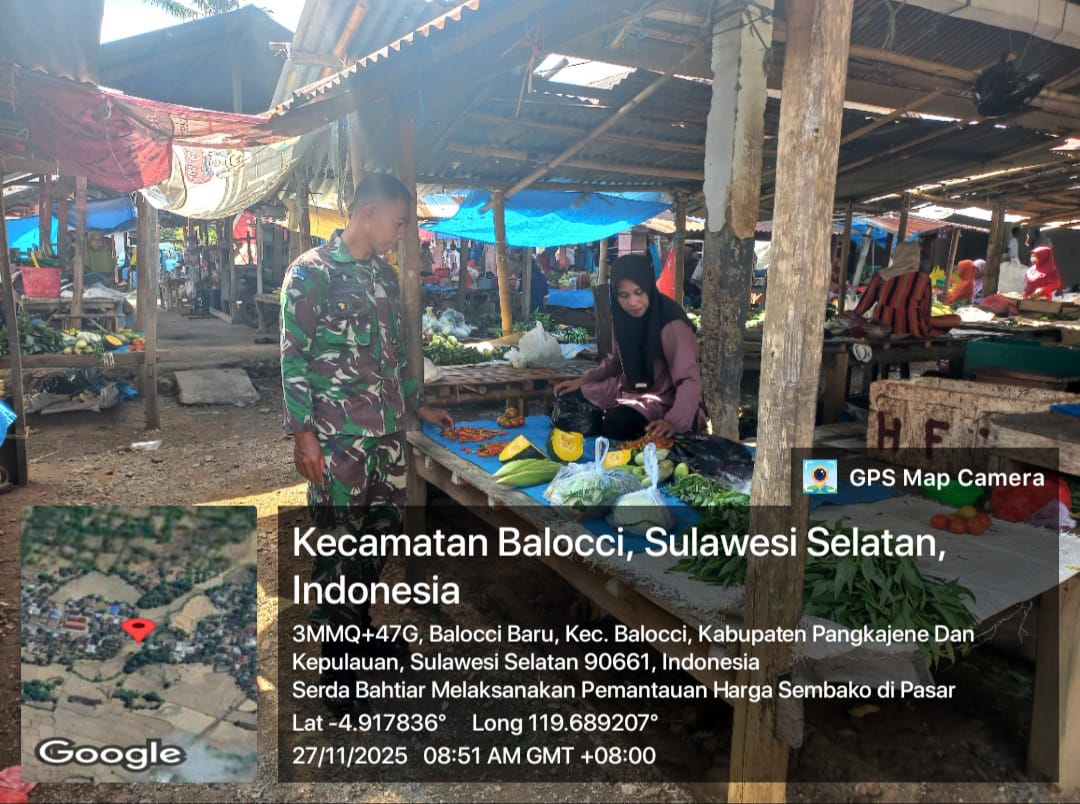klivetvindonesia.com,Balocci, Pangkep – Dalam upaya menjaga stabilitas harga bahan kebutuhan pokok serta memastikan ketersediaan barang untuk masyarakat, Babinsa Kelurahan Balleangin, Serda Bahtiar, melaksanakan kegiatan pemantauan harga jual beli di Pasar Balleangin, Kelurahan Balleangin, Kecamatan Balocci, Kabupaten Pangkep, pada Kamis, 27 November 2025 pukul 08.30 Wita.
